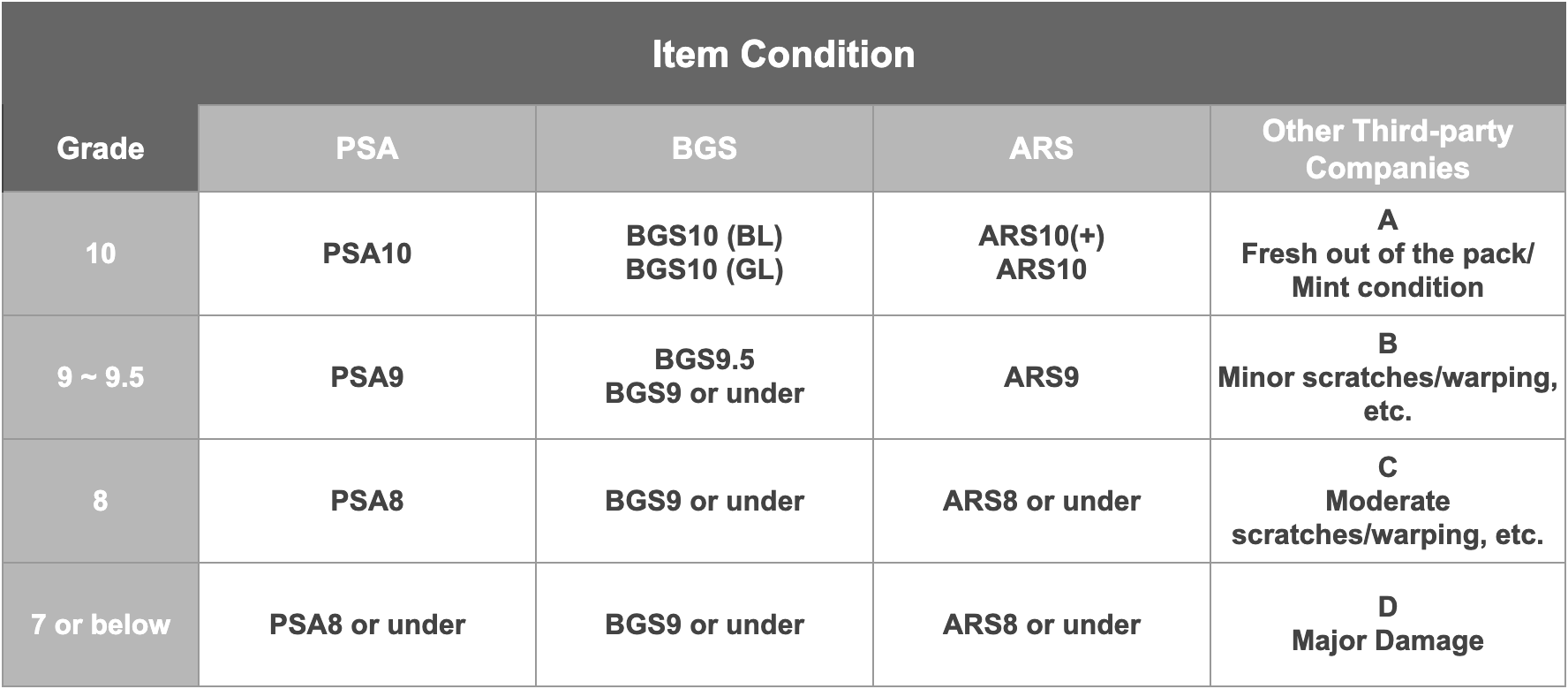 *The inspection and authentication requirements for PSA, BGS, ARS items and unopened cards (items enclosed in sealed packaging) are different. Please check the bottom of this page for details.