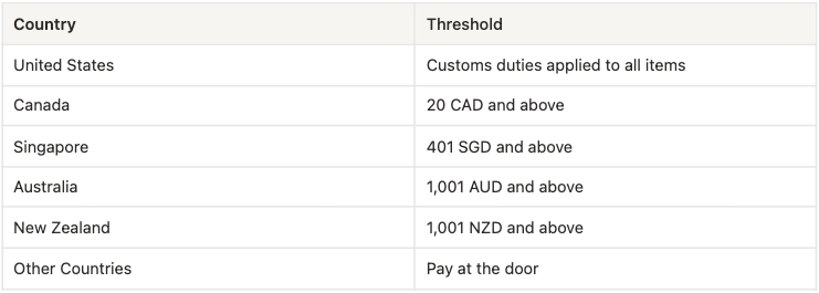*About customs duties, additional processing fees may be charged regardless of the above thresholds (merchandising processing fees, entry transaction fees etc.)