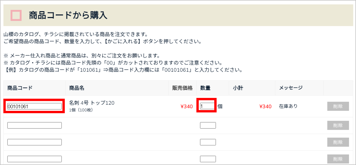 ⇒商品コード入力欄には「00101061」と入力してください。