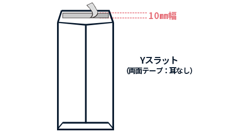 テープ加工は、フラップからテープの耳が左右に出ない「Yスラット」のタイプになります。テープの幅は10㎜幅のタイプのみになります。
