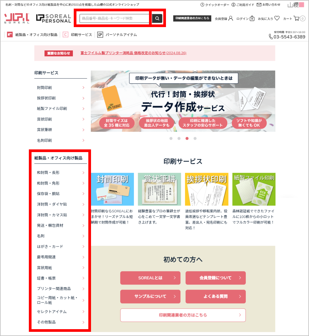 『商品番号・商品名・キーワード検索』の検索窓もしくは『紙製品・オフィス向け製品』のカテゴリからご希望の商品を検索してください。条件を指定して検索したい場合は、『商品番号・商品名・キーワード検索』の虫眼鏡マークをクリックして詳細検索をご利用ください。