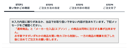 メーカー仕入品と通常商品を同じカートに入れるとエラーメッセージが表示されます