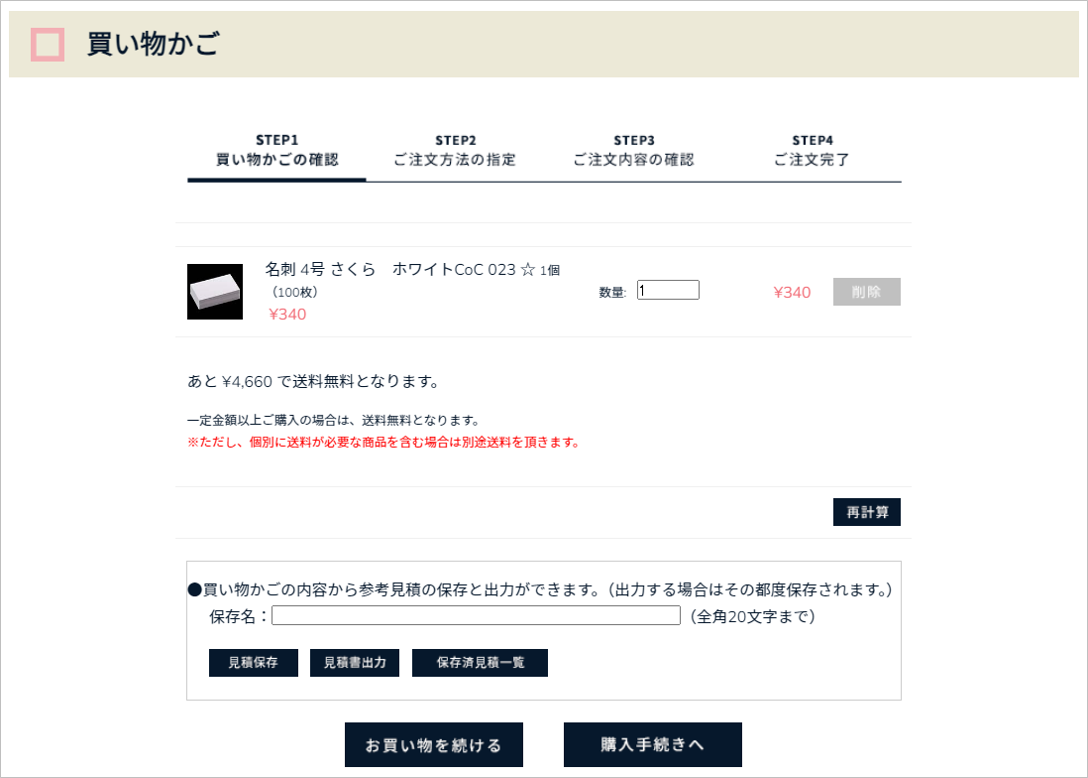 • カート内容を保存したい場合、「見積保存」をクリックすると「保存済見積一覧」へ保存されます。