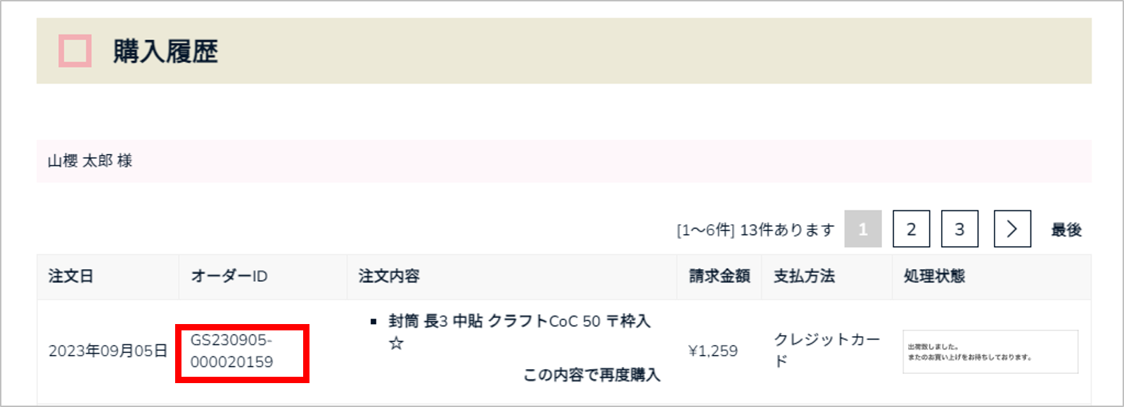 (3)購入履歴の一覧より、納品書を発行する注文のオーダーIDをクリックしてください。