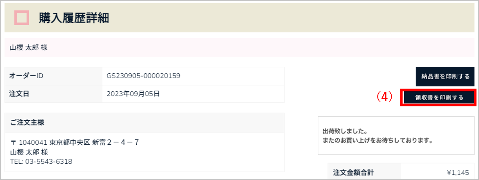 (4)購入履歴詳細より、「領収書を印刷する」ボタンを押してください。