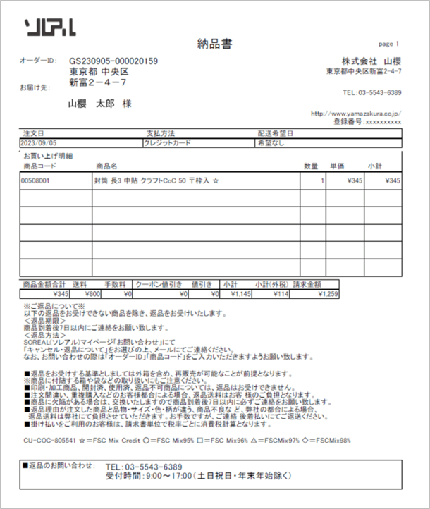 後払い(コンビニ・銀行)でお支払いの場合、SOREALでは領収書を発行できません。お支払い先のコンビニや銀行が発行する領収書やご利用明細票、配送業者が発行する領収書をご利用ください。