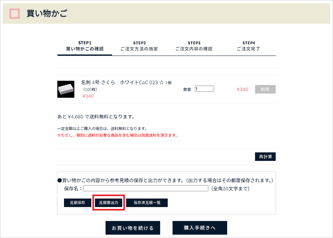 (3)買い物かごの「見積書出力」ボタンをクリックすると見積書が発行されます。