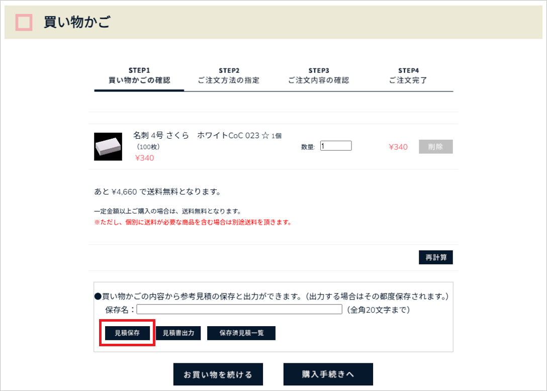 (4)買い物かごの内容を保存したい場合は、「見積保存」ボタンをクリックすると、「保存済み見積一覧」へ内容が保存されます。