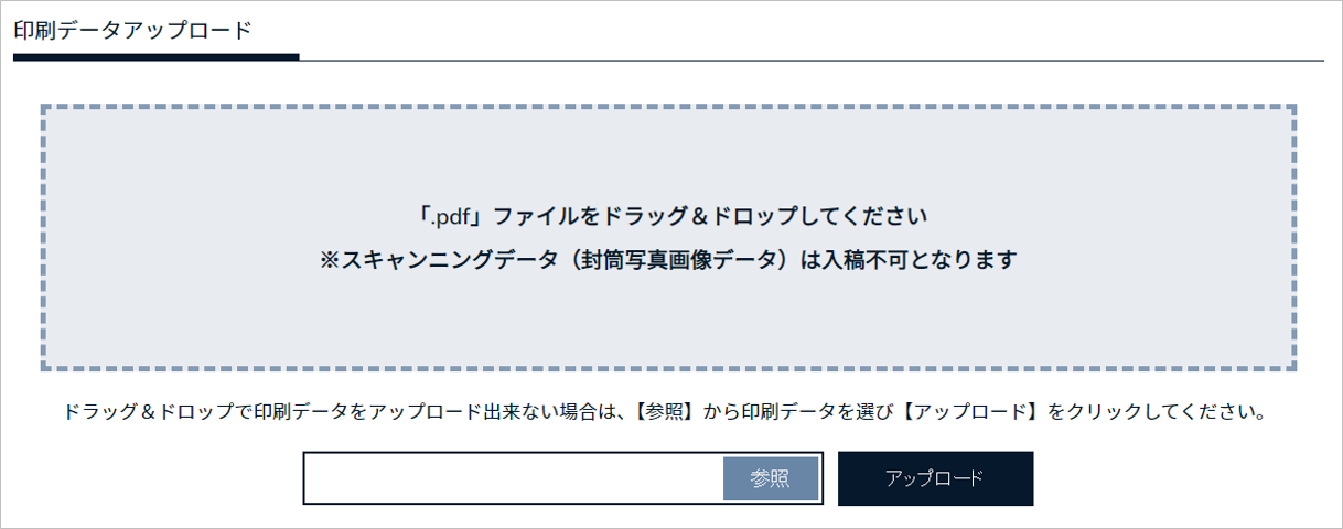※ドラッグ&ドロップで印刷データをアップロード出来ない場合は、「参照」ボタンから印刷データを選び 「アップロード」をクリックします。