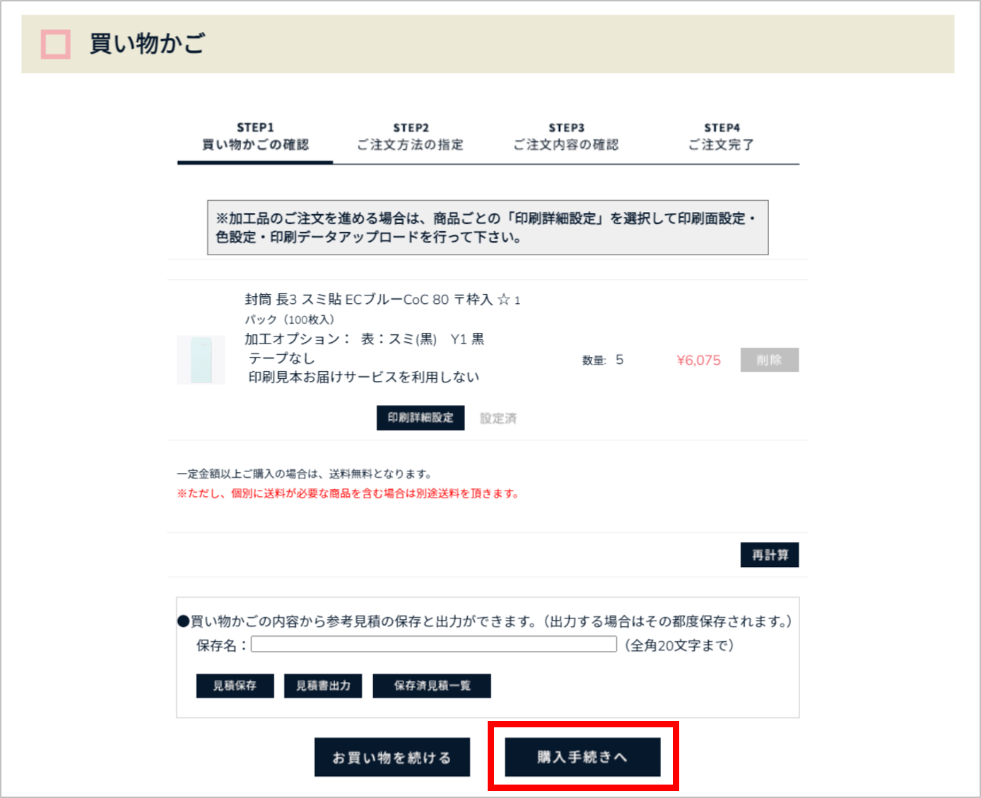 ※印刷データのアップロードが完了しないと購入手続きへ進むことができません。