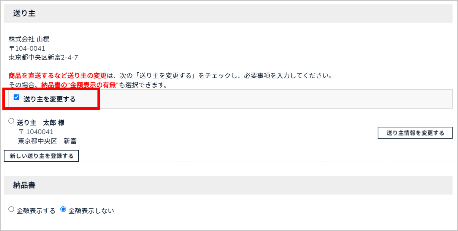 「送り主を変更する」にチェックを入れると「納品書」の選択枠が表示されます。納品書に金額を表示するかしないかを選択することができます。