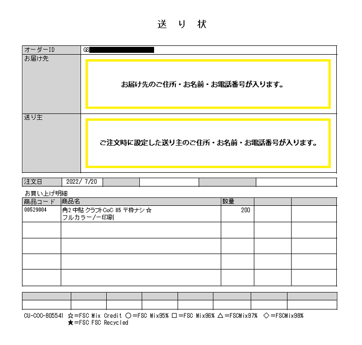 納品書欄で「金額表示しない」をお選び頂くと、送り状が商品に同封されます。