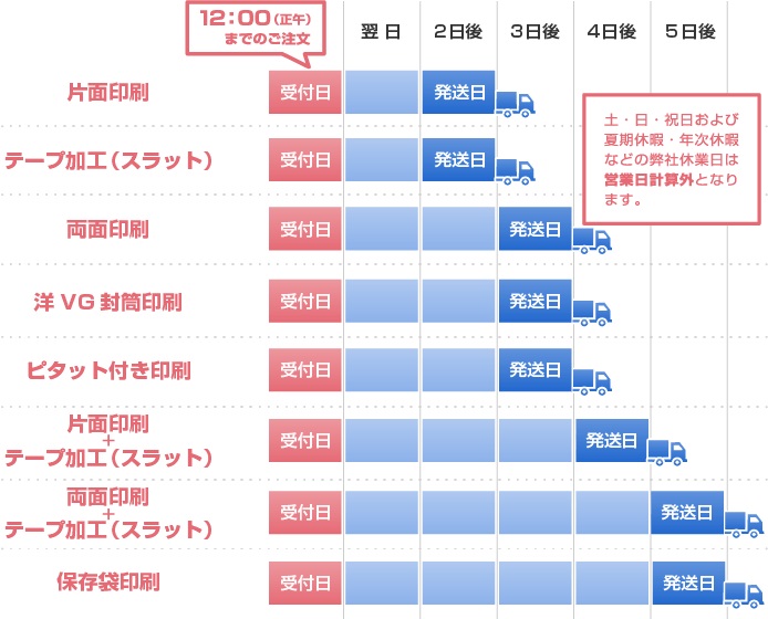 印刷加工商品の納期は下記のとおりです。 出荷日は、ご注文内容(印刷加工)と受付日により決まります。