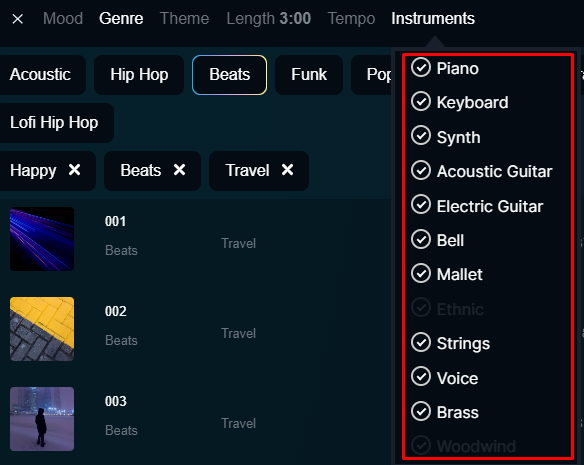 You can also choose to include or exclude specific instruments. Just click to select your preferences. Some tag combinations may automatically include or remove certain instruments to better fit the selected vibe.