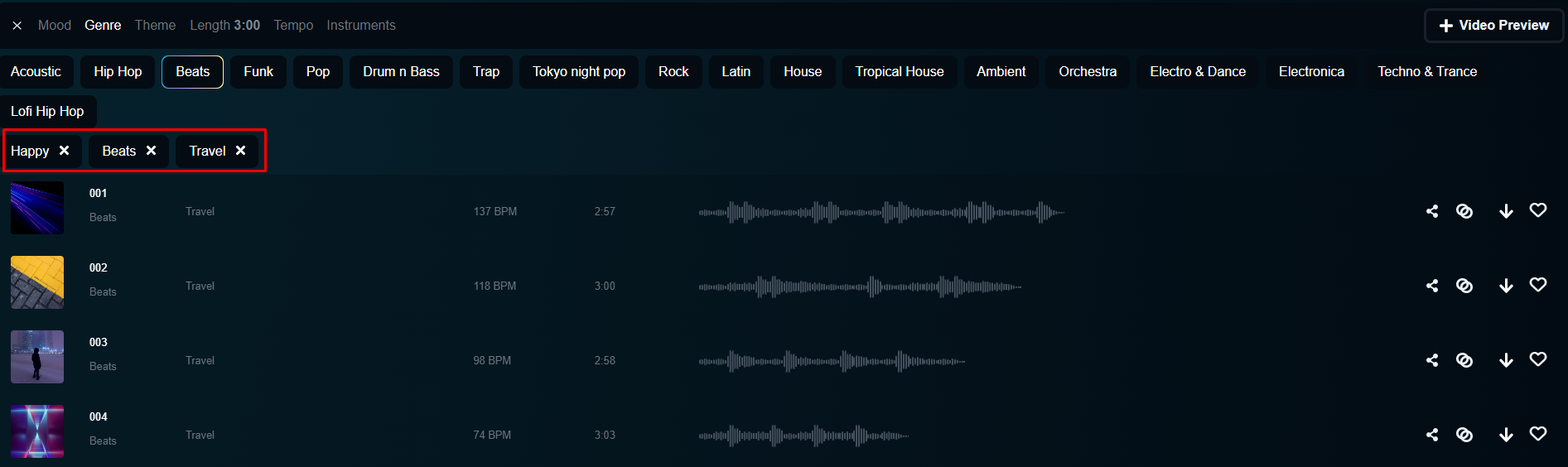 As you add tags, they’ll appear at the top. A song list will generate based on your selections - you can freely add or remove tags, and the song list will refresh accordingly.