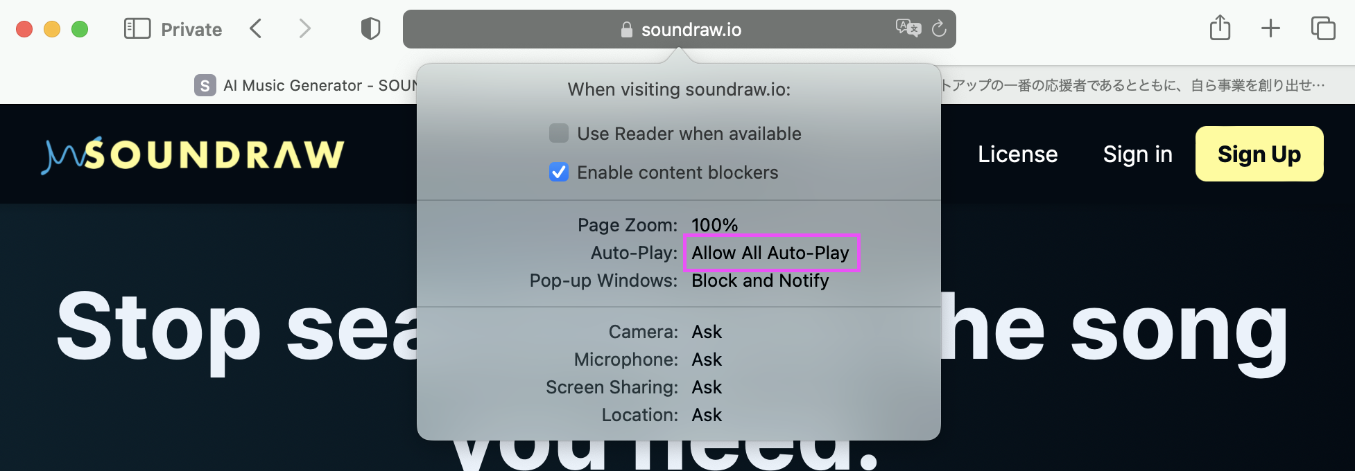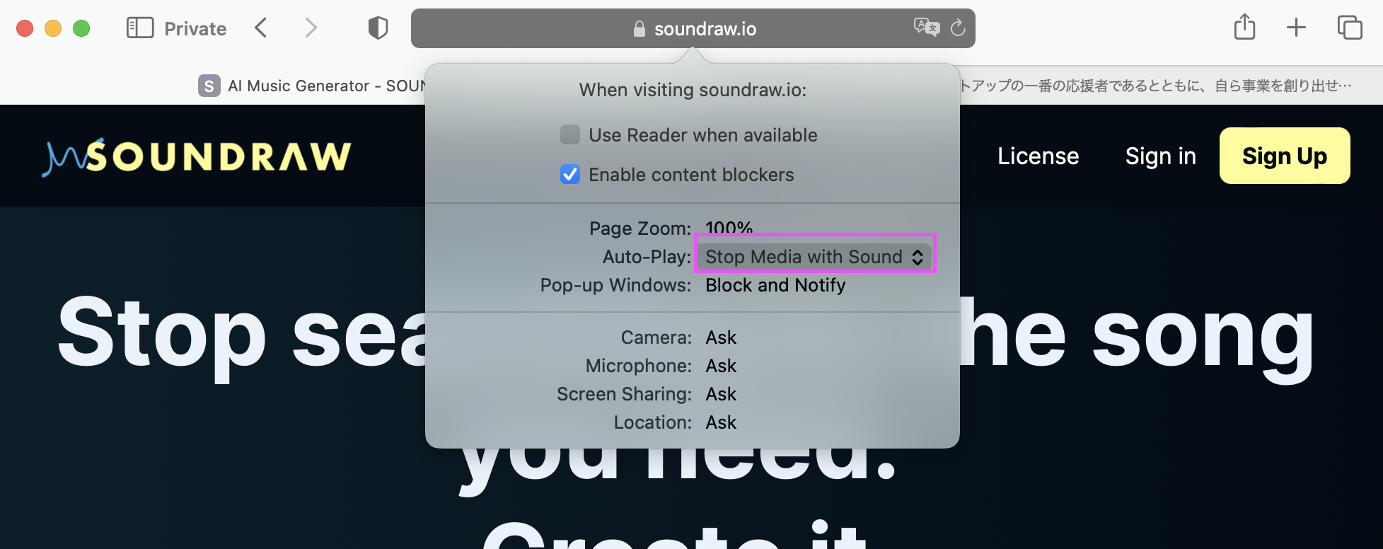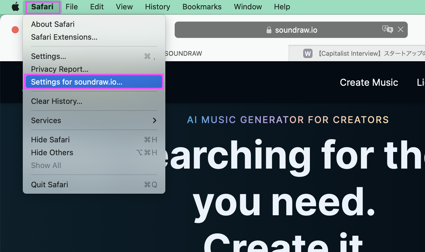 1. Click "Safari" mark above and "Settings for soundraw.io"