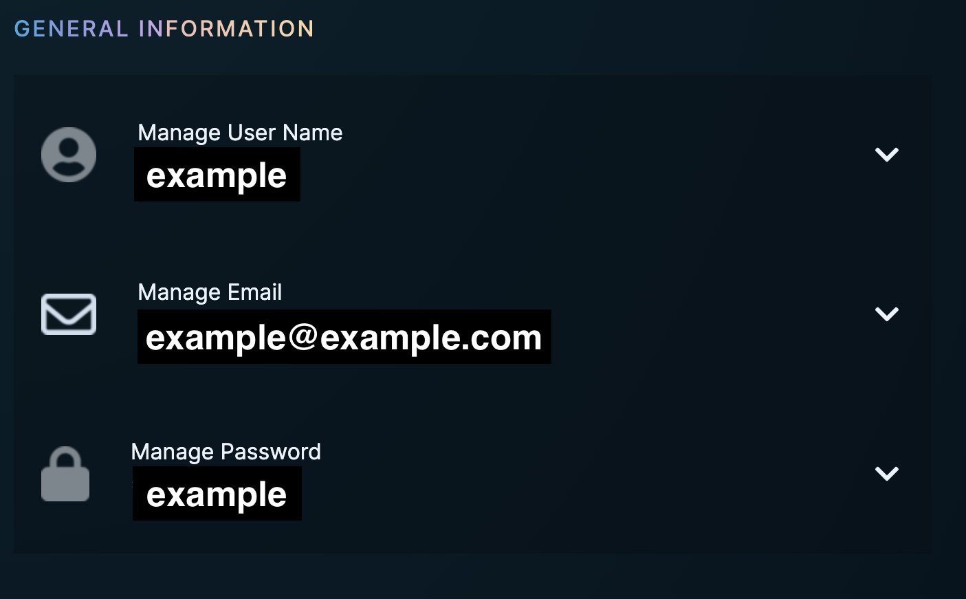 To change your email address, password, or username, click on the downward-pointing 🔽 arrow below each respective field, and you will be able to make the necessary modifications.