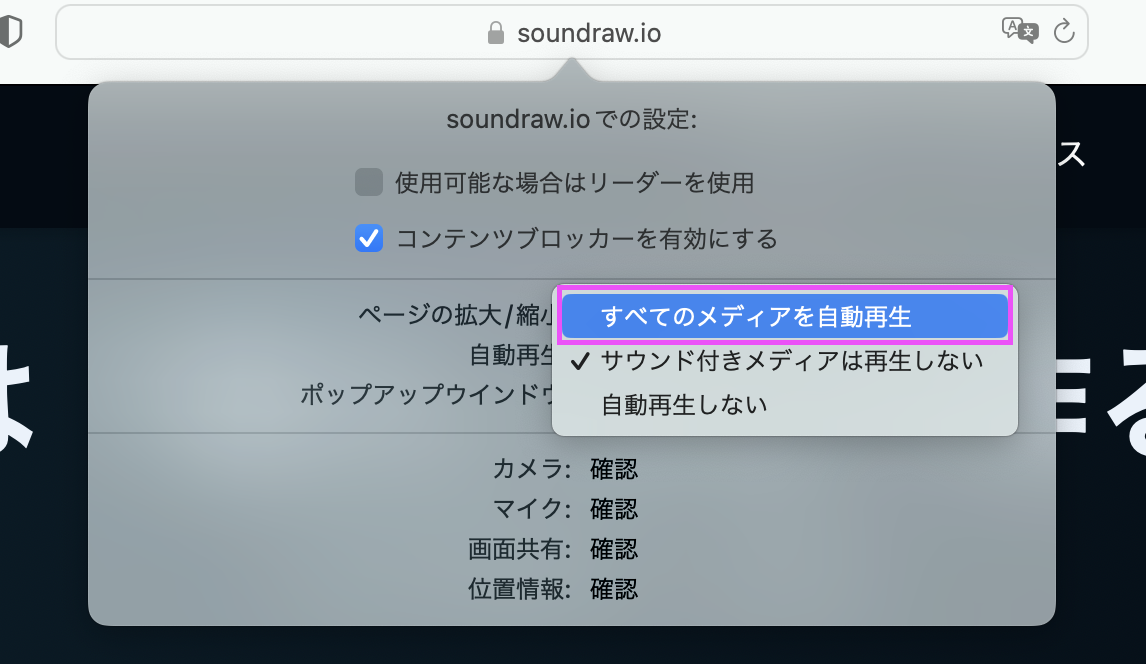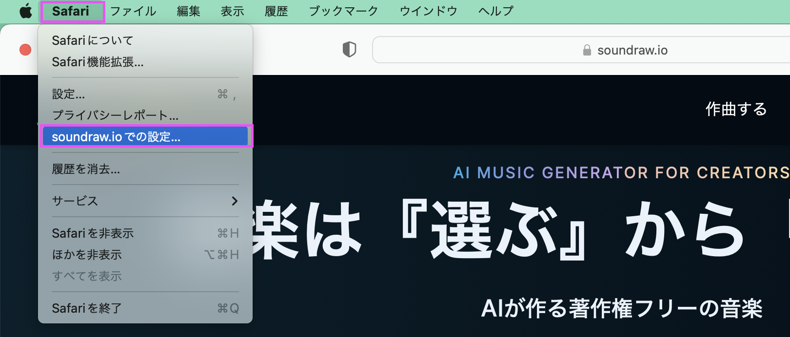 1. SafariでSOUNDRAWのWebサイトを開いている状態で、左上の「Safari」タブを開き、「soundraw.ioでの設定...」をクリックします。