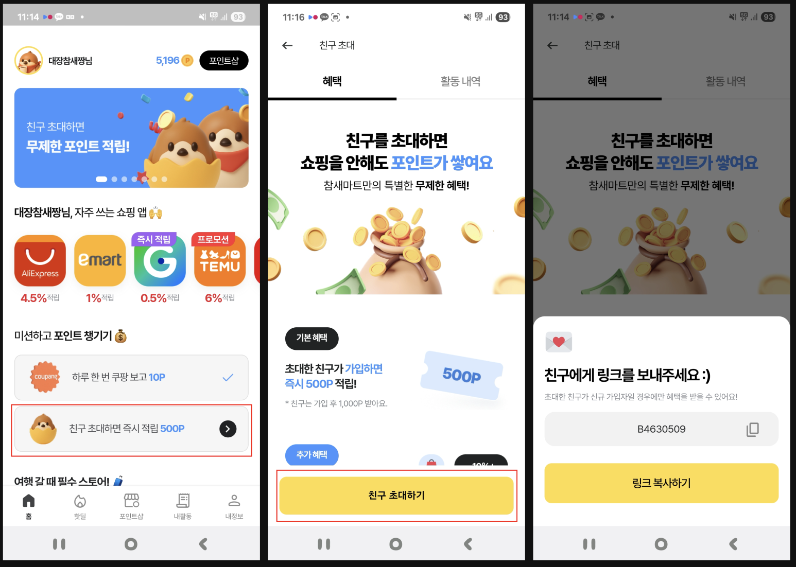 홈에서 "친구 초대하면 즉시 적립 500P" 버튼을 눌러 들어가서 "친구 초대하기" 버튼을 눌러 친구에게 공유해주세요.