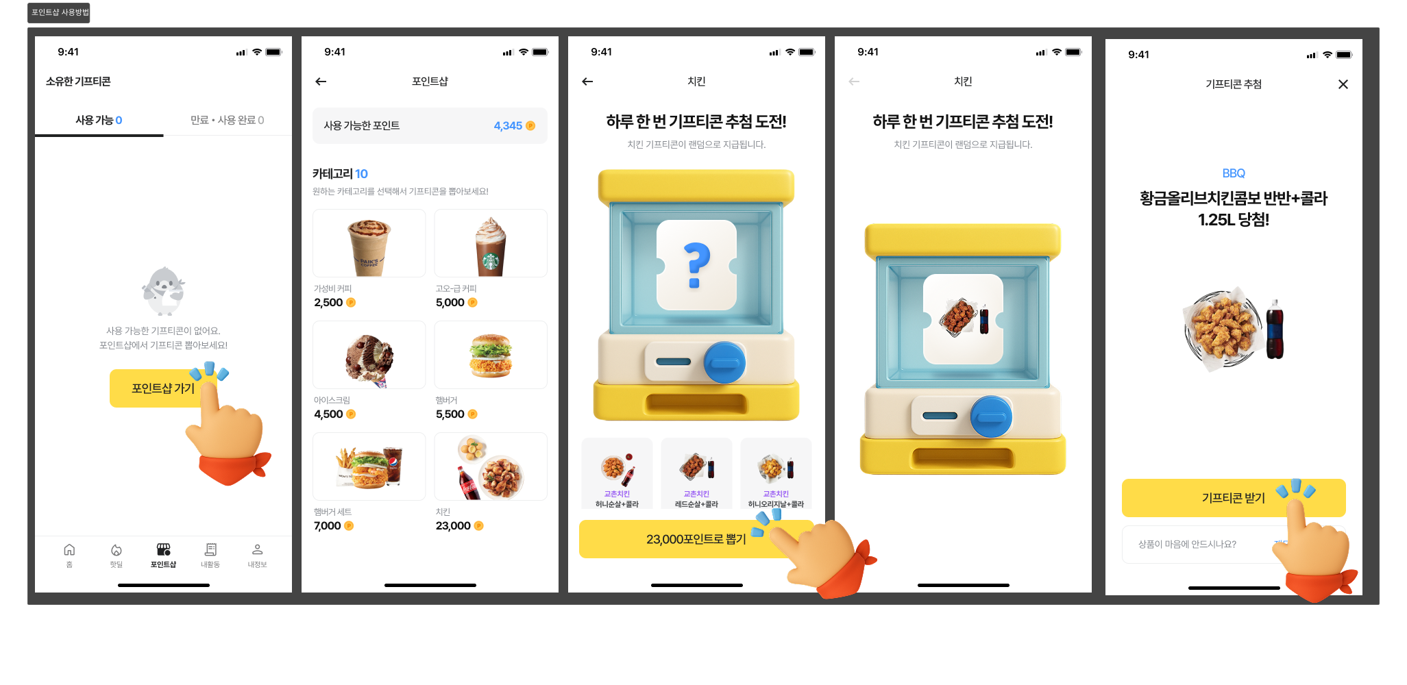 각 카테고리에 필요한 포인트를 모아 랜덤 기프티콘을 뽑아보세요 :)