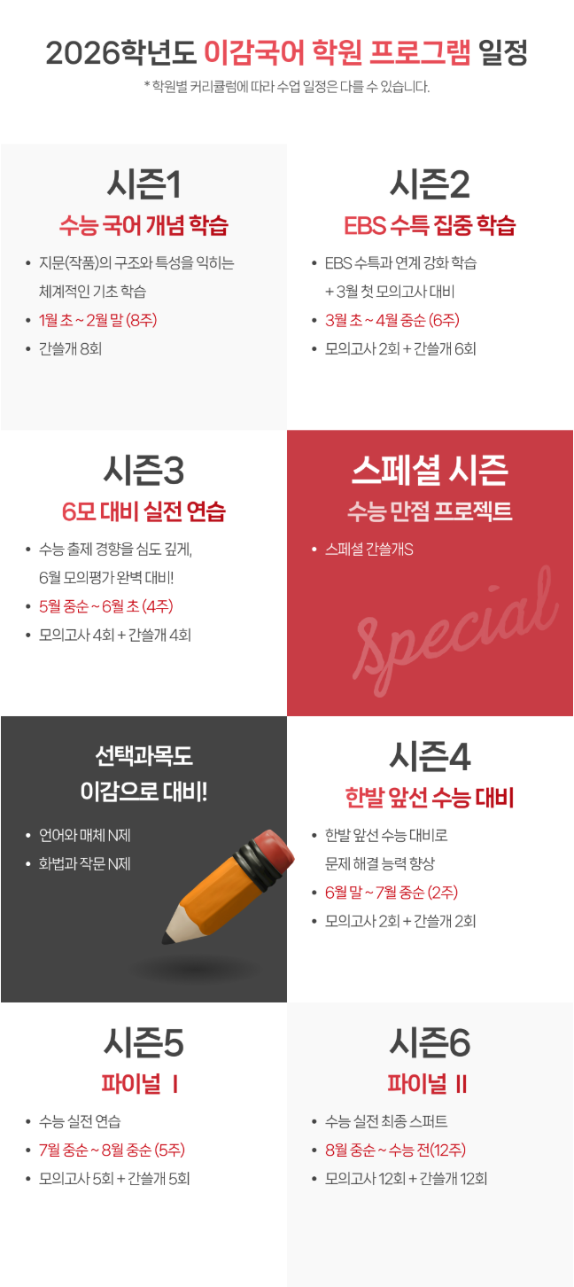 매 시즌마다 시기적 특성에 따른 콘텐츠로 발행되며, 국어 모의고사 시험지 혹은 주간지 등으로 구성됩니다. (시즌마다 주차, 구성 상이)