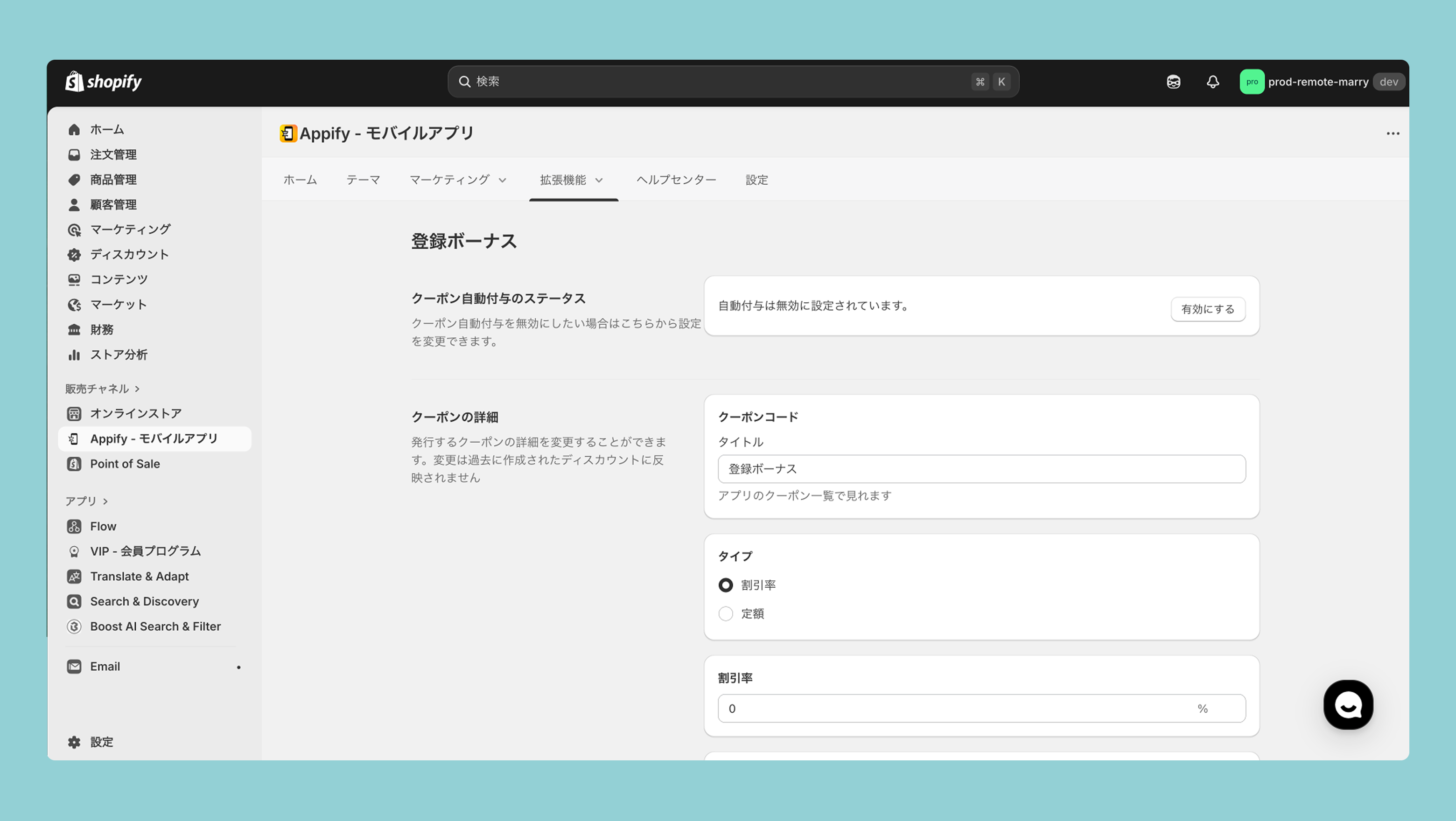 Appify管理画面>拡張機能>登録ボーナスから設定可能です。