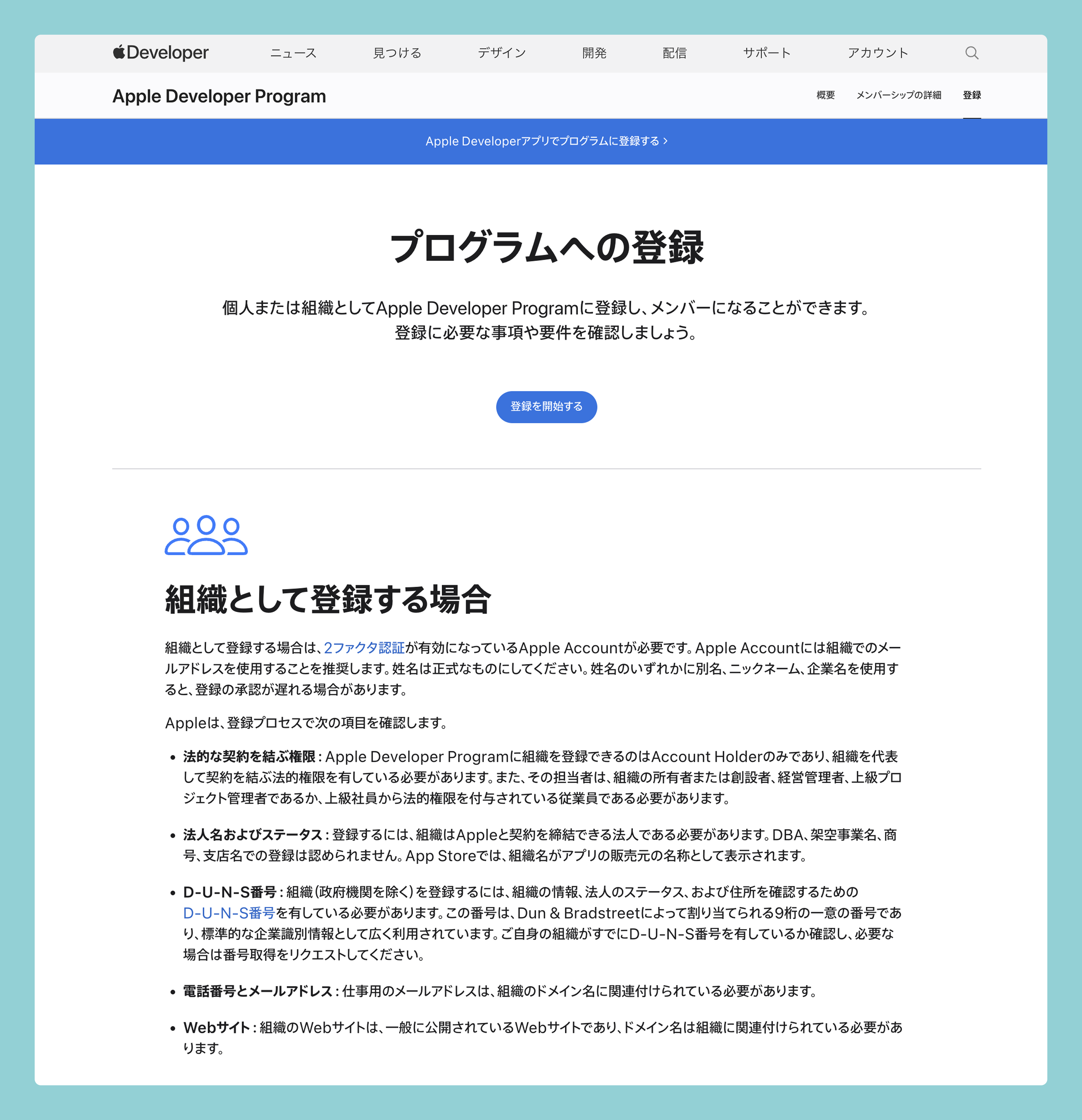 Apple App Storeにアプリを掲載するためには、Appleにて開発者アカウントを作成・連携する必要があります。そのためには、以下4つのステップを進めてください。