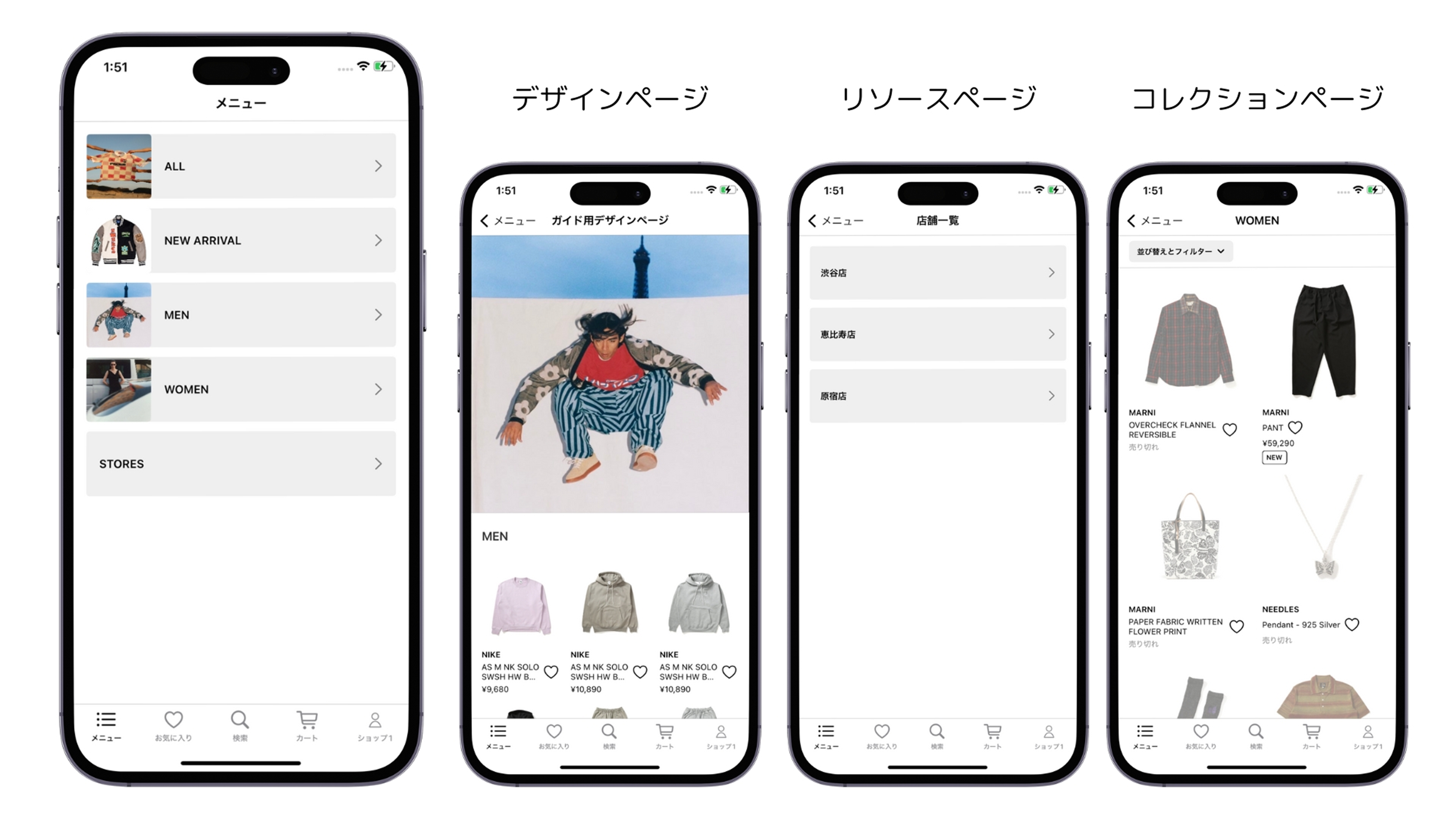 Appify管理画面の「テーマ」内にて、デザインページ>リソースページ>コレクションページの順で設定するのがスムーズです。