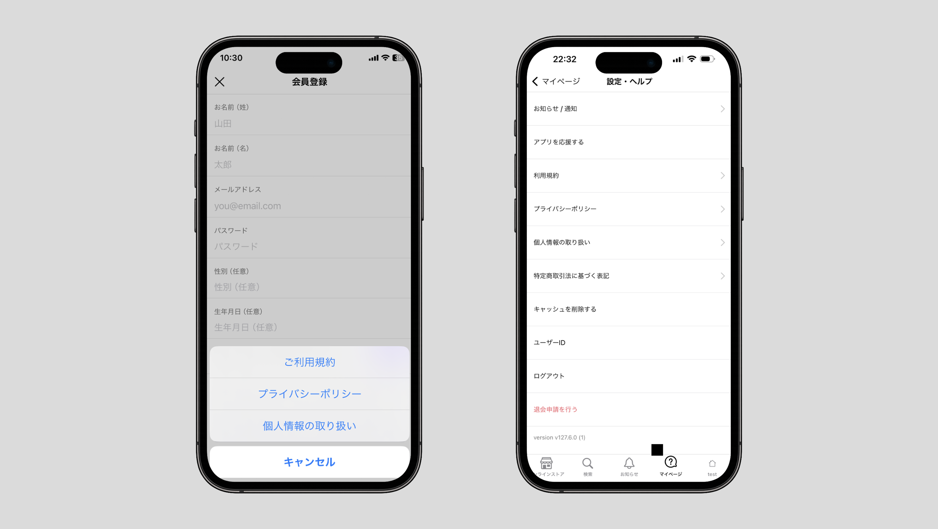モバイルアプリの、マイページ>アプリ設定で表示されるショップの各種規約ページURLの設定です。このリンクは会員登録時に表示されるモーダルリンクにも表示されます。