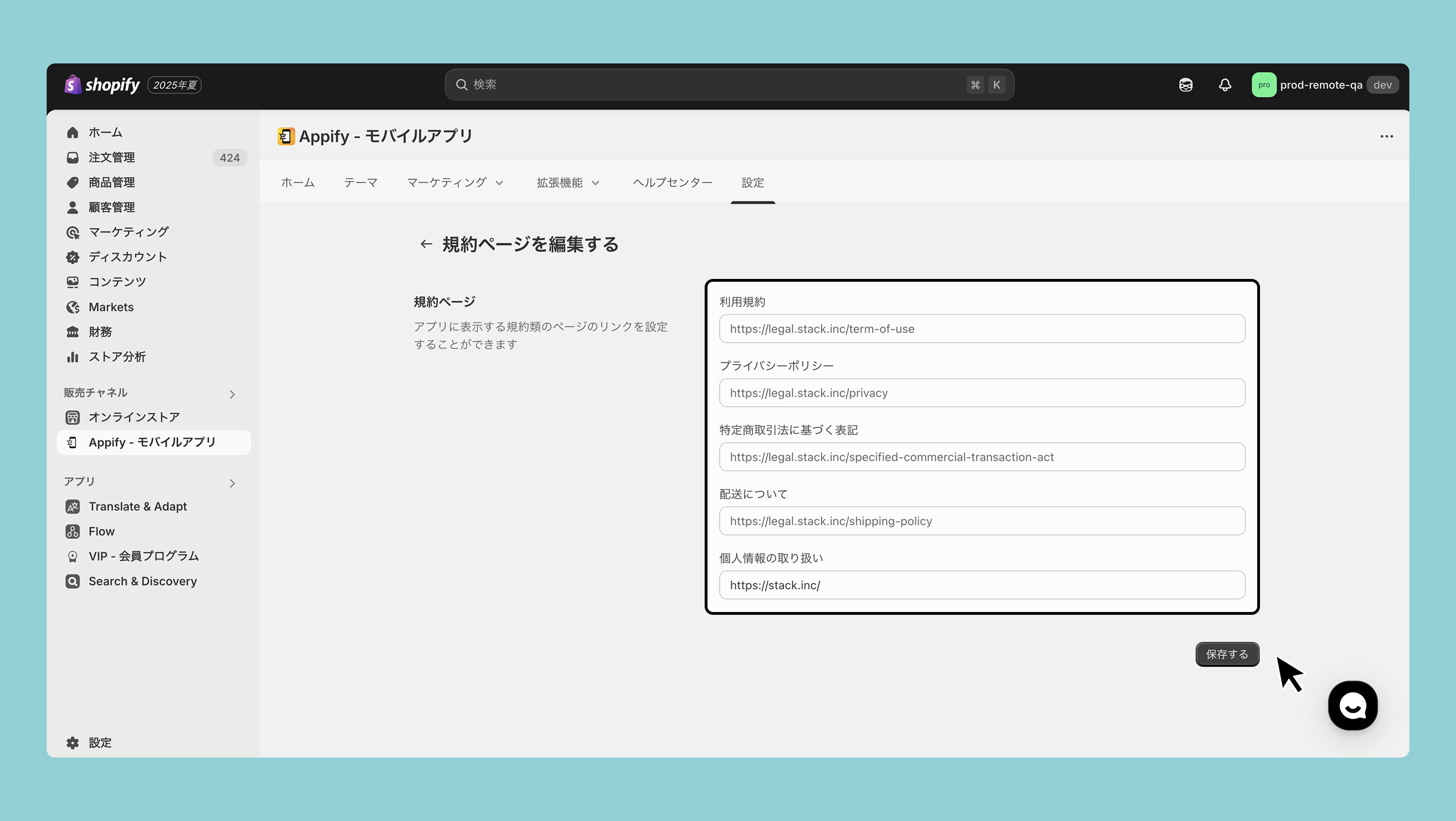 モバイルアプリに表示される各種規約ページのURLを、該当する項目ごとに設定してください。