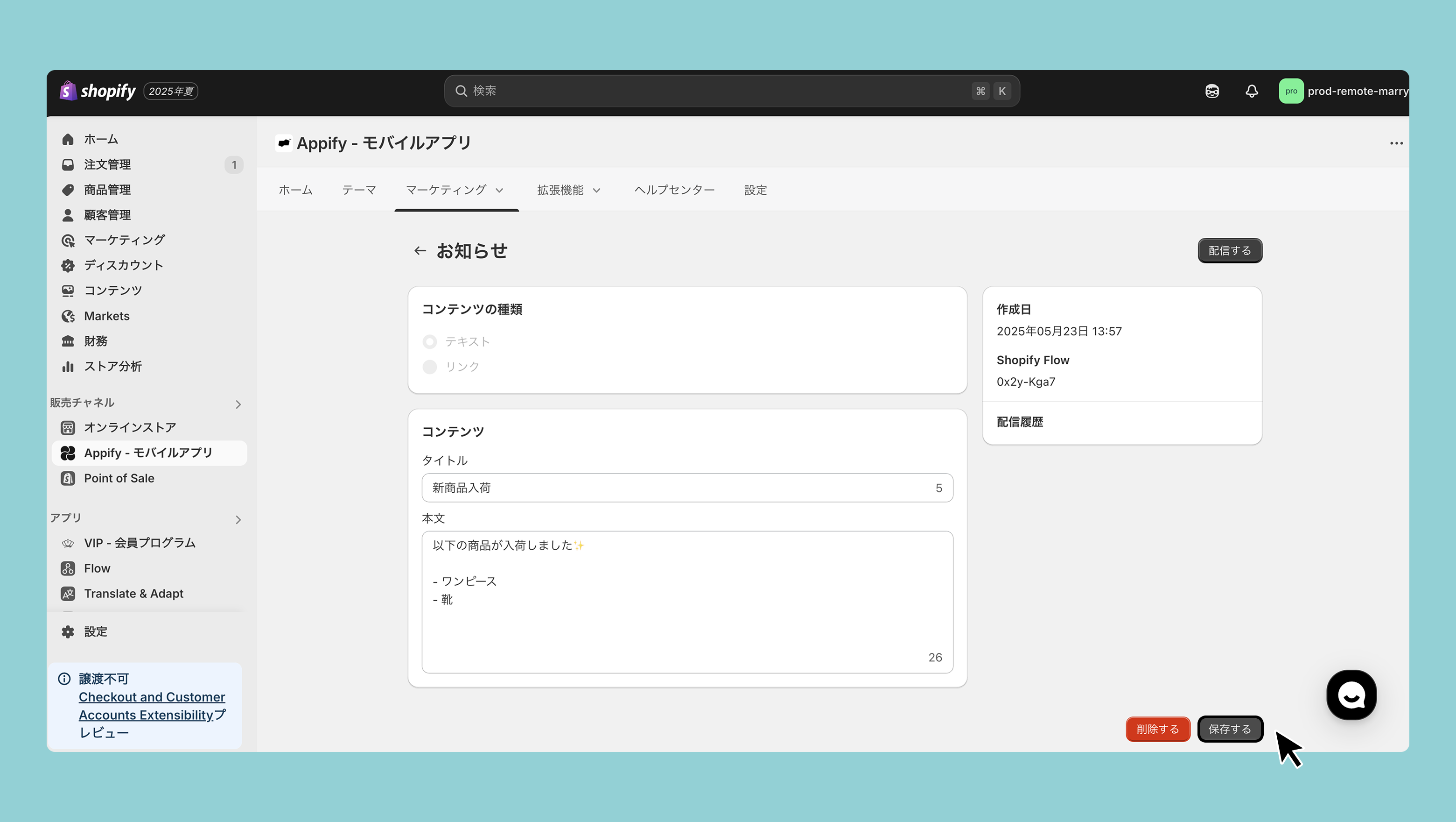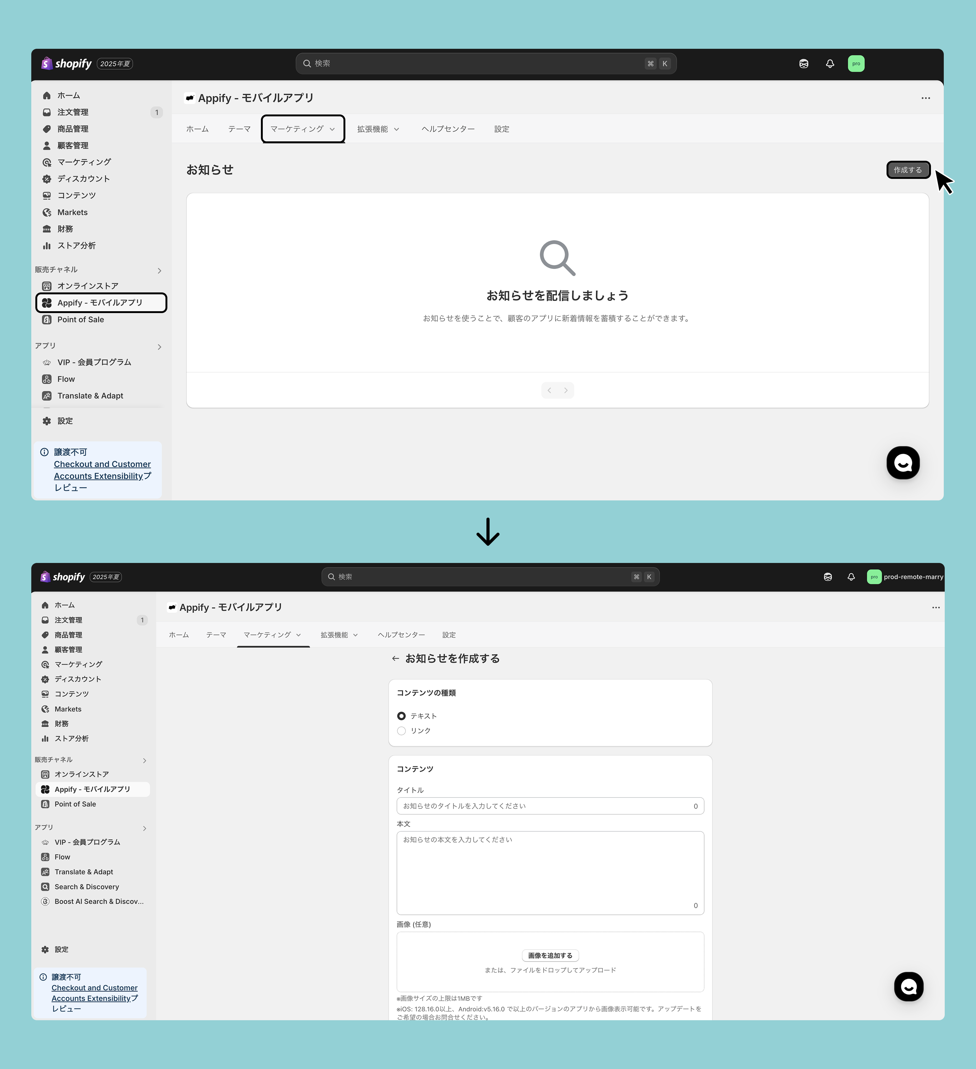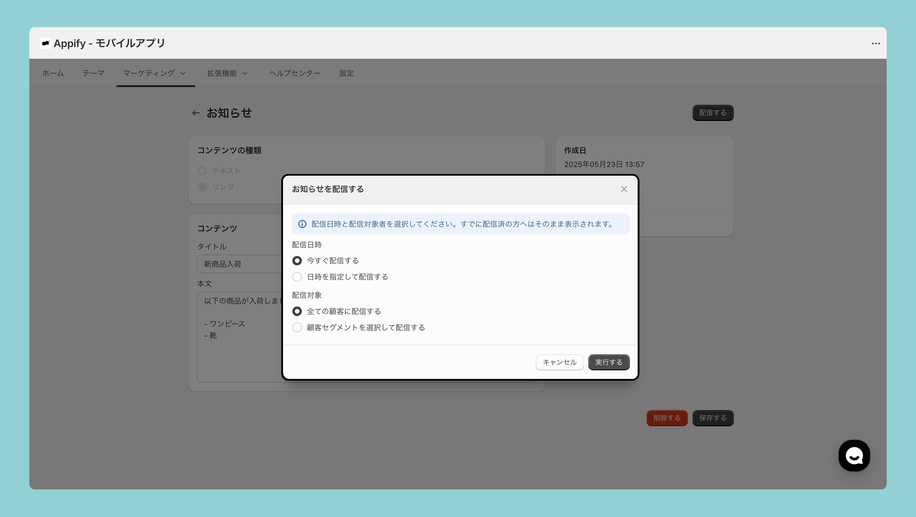 モバイルアプリ管理画面>マーケティング>お知らせから設定ができます。