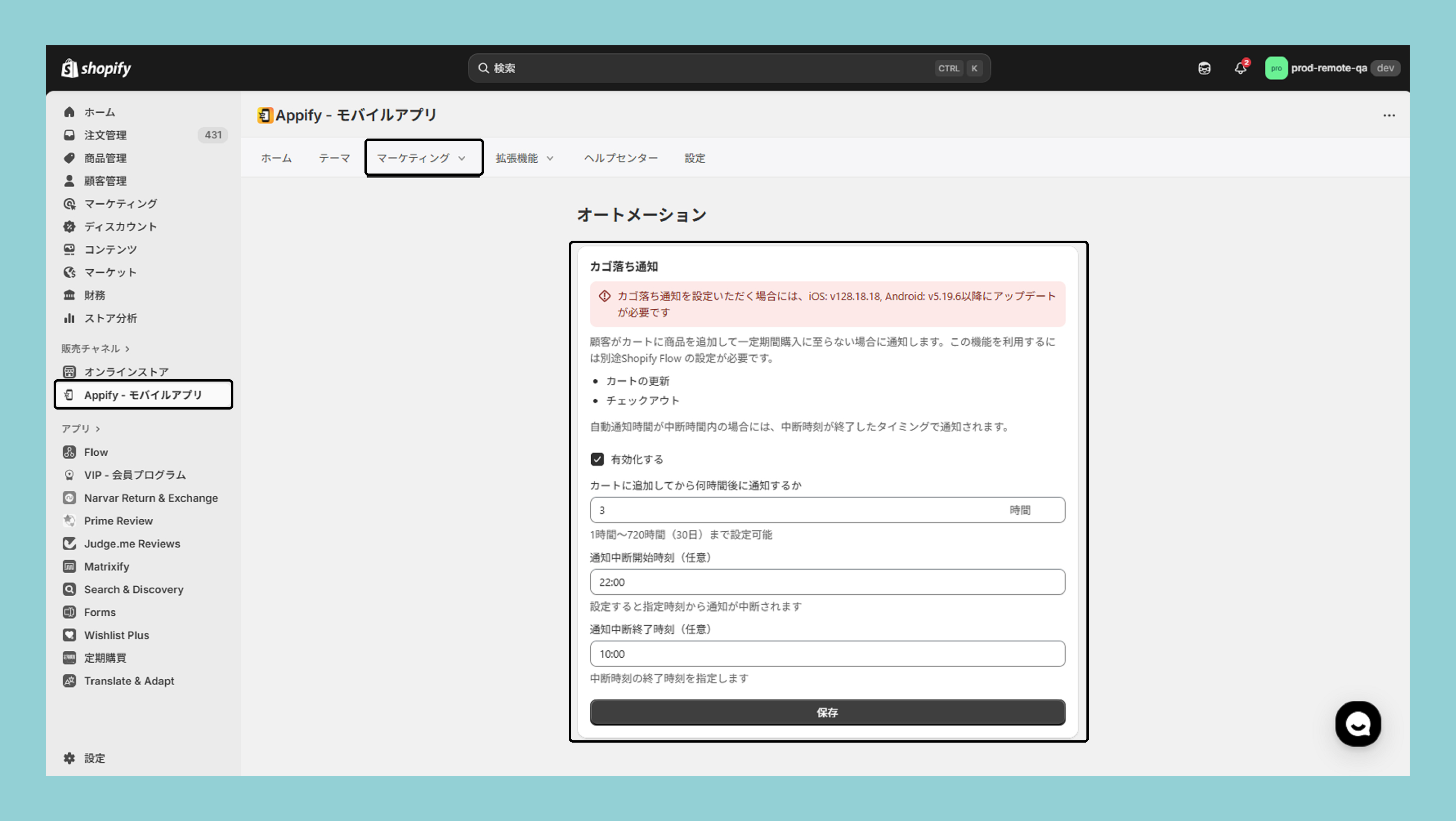 モバイルアプリ管理画面>マーケティング>オートメーションから設定ができます。