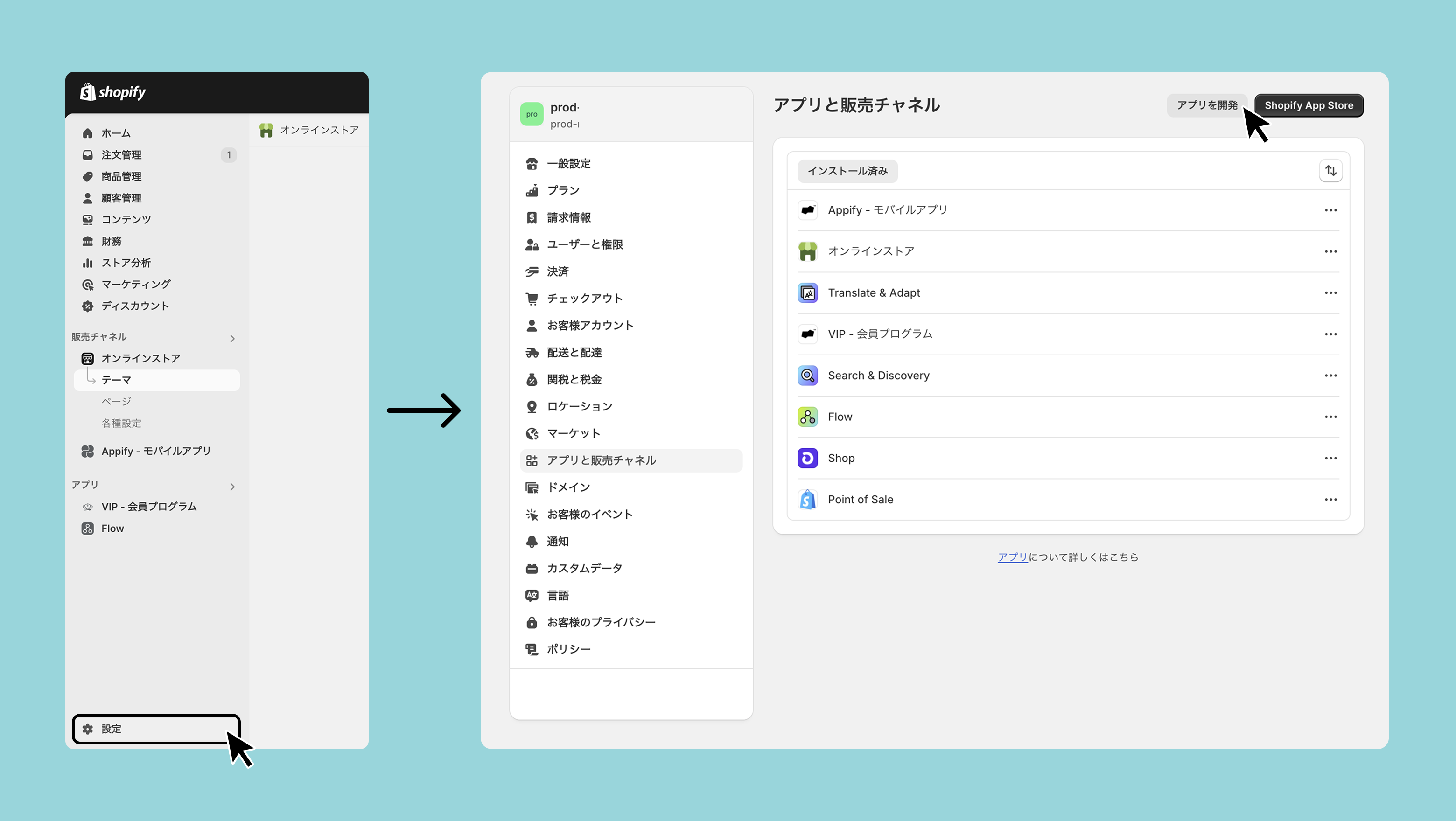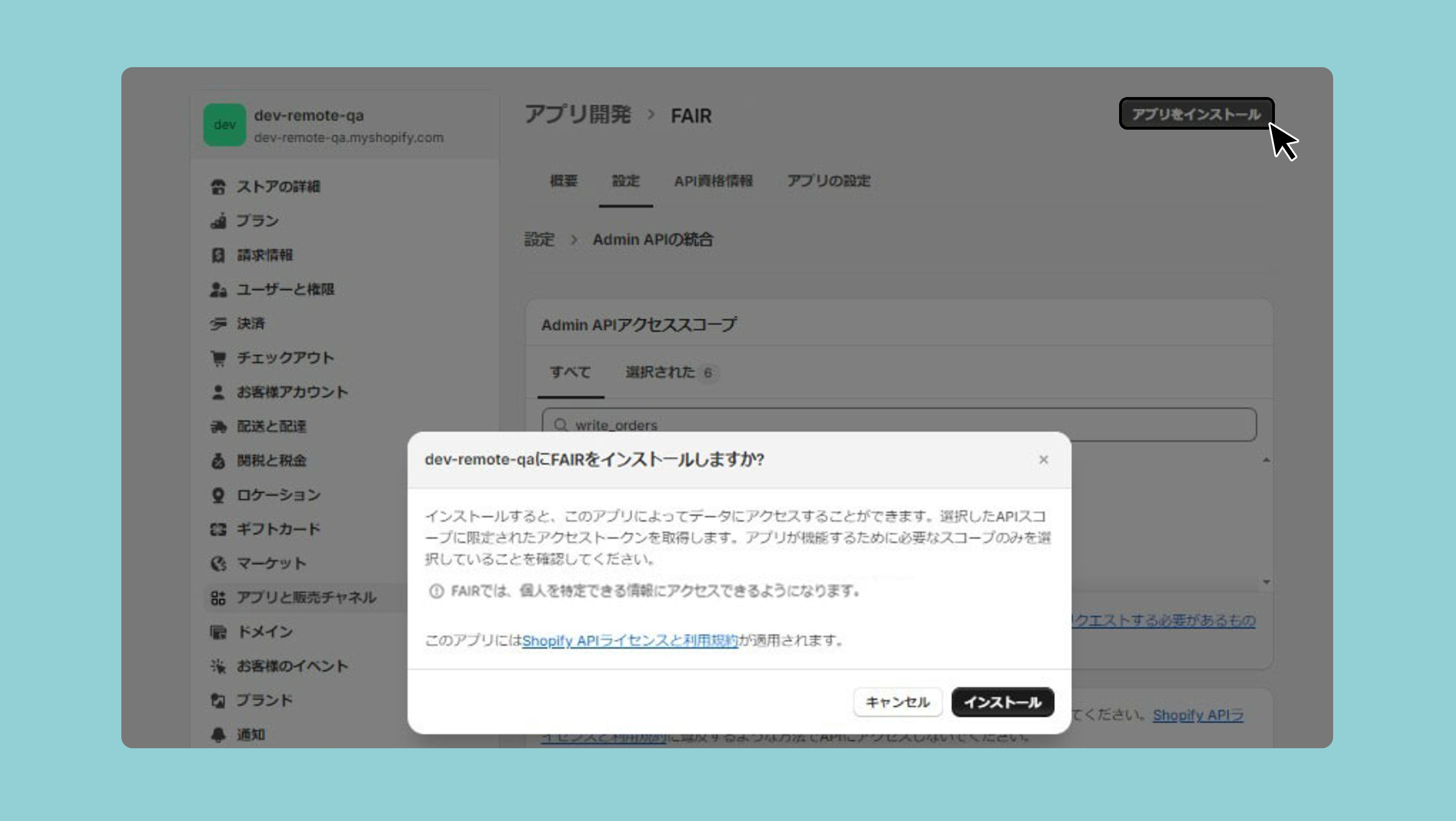 先ほど作成したアプリを選択し、概要タブの 「Admin APIスコープを設定する」をクリックしてください。
