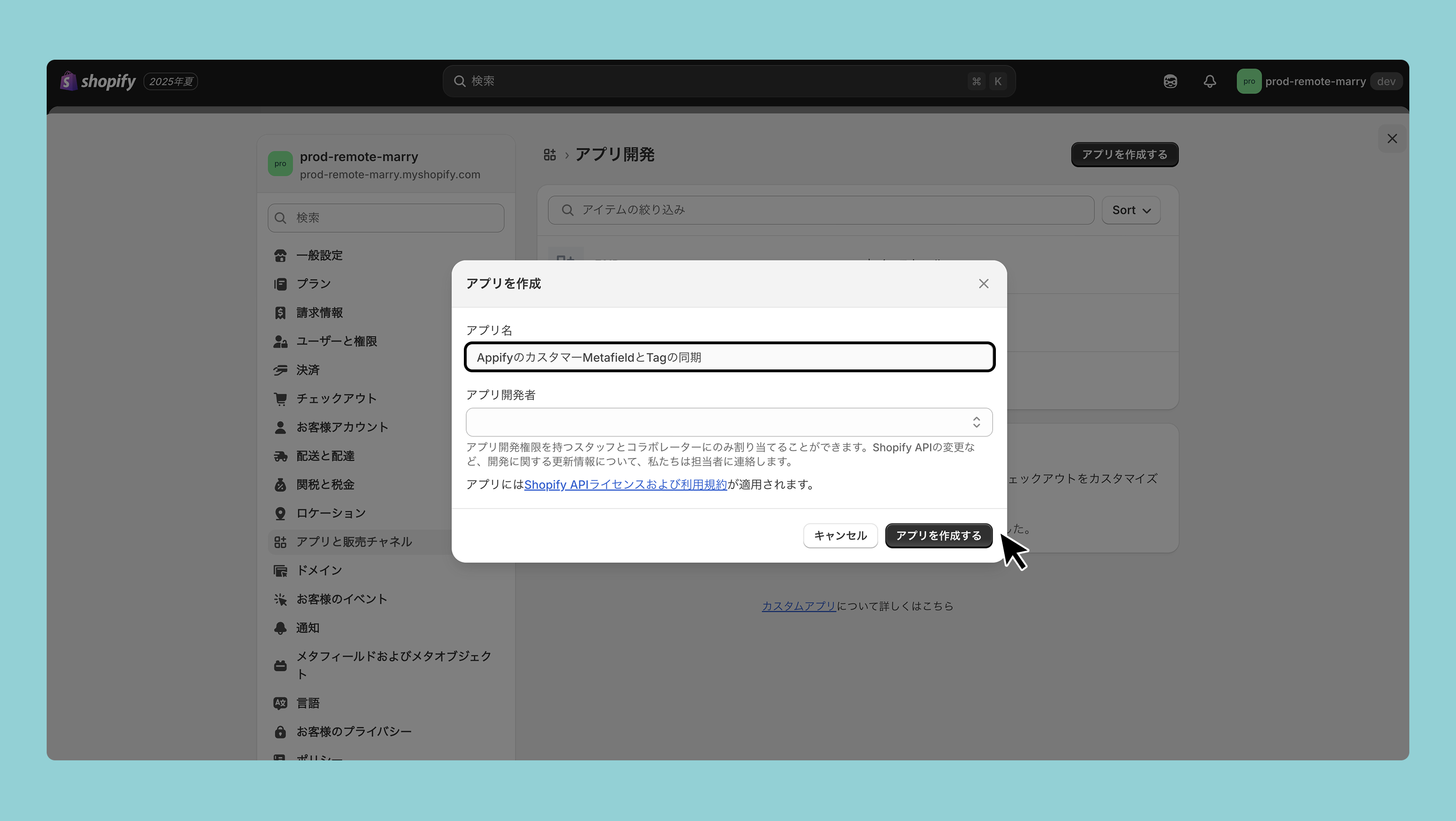 その次に右上の[アプリ作成]から、アプリ名に「AppifyのカスタマーMetafieldとTagの同期」と入力し右上の「アプリを作成」ボタンをクリックしてください。