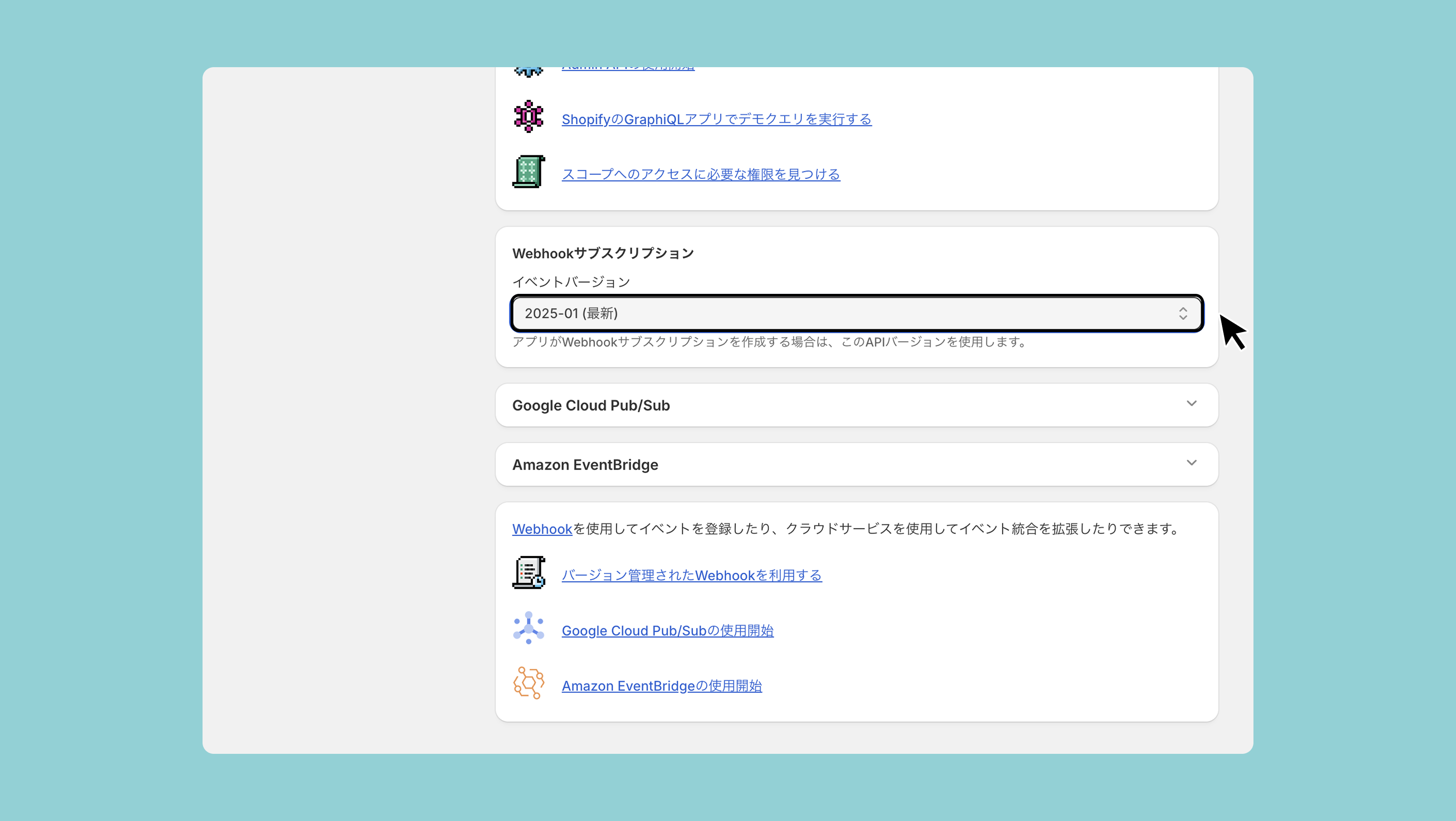そのまま下にスクロールし、Webhookサブスクリプション>イベントバージョンで「(最新)」と書かれたバージョンを選択し[保存ボタン]をクリックしてください。