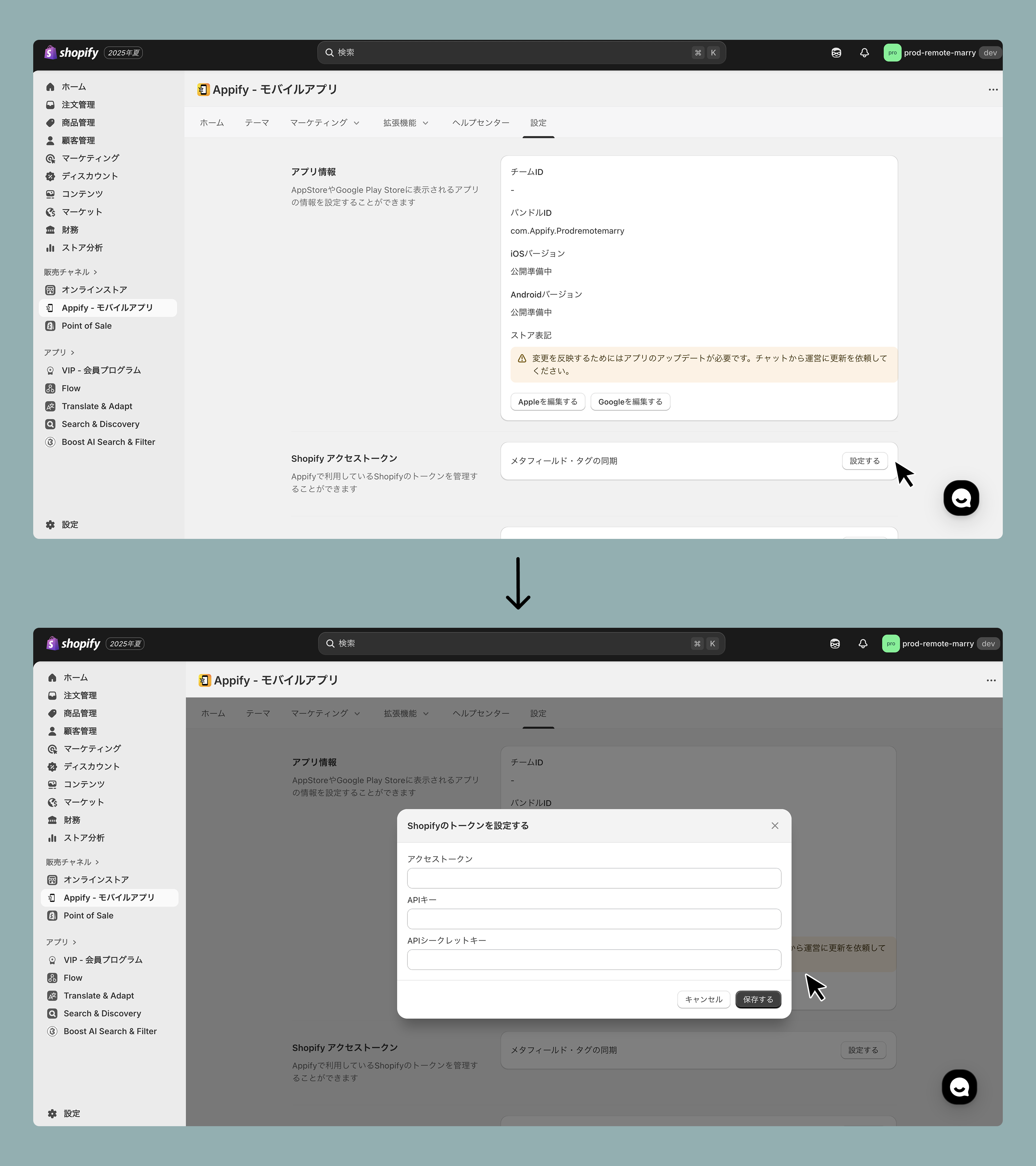 Appify管理画面にログインし、設定>Shopifyアクセストークン>設定するをクリックします。