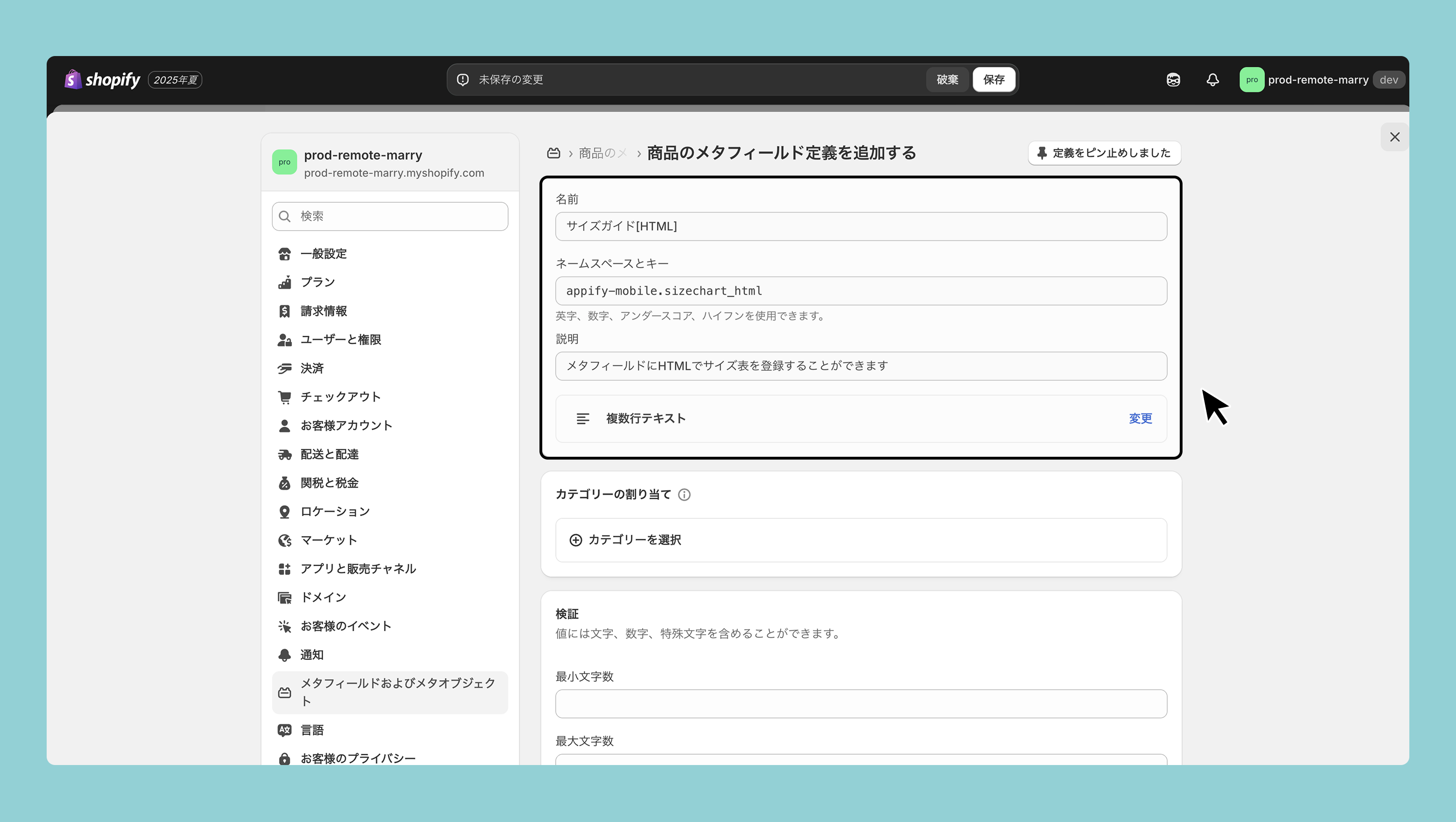 Shopify管理画面>設定>メタフィールドとメタオブジェクト>商品>定義を追加するから設定を行います。