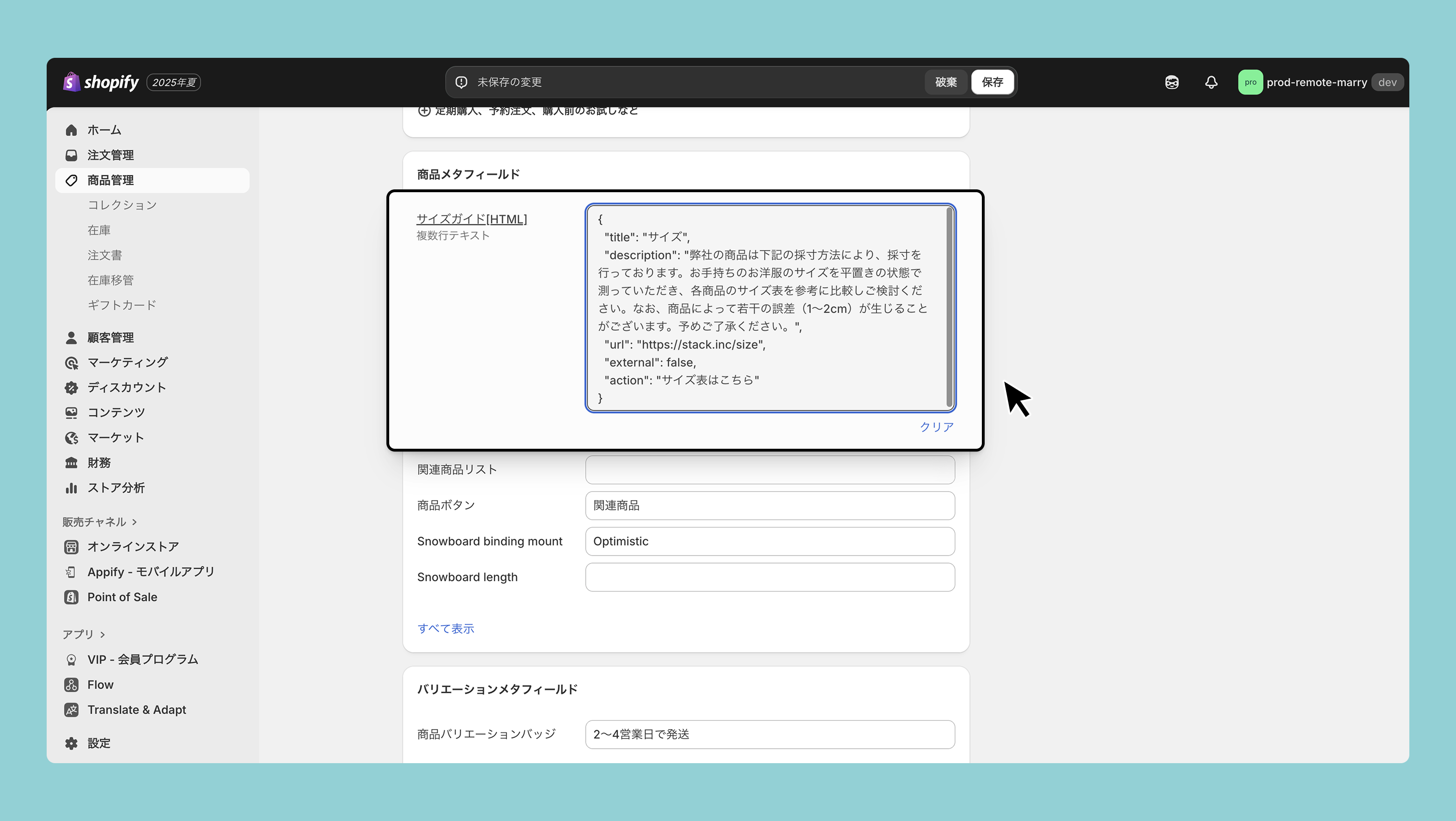 Shopify管理画面>商品管理>ボタンをつけたい商品>メタフィールド>商品メタフィールド>サイズ表にて表示したい情報を入力します。