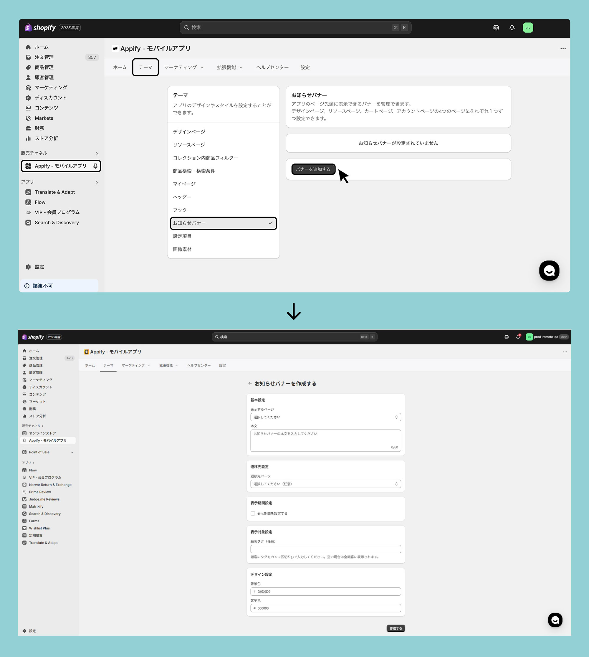 Appify管理画面>テーマ>お知らせバナー>バナーを追加するから、作成します。