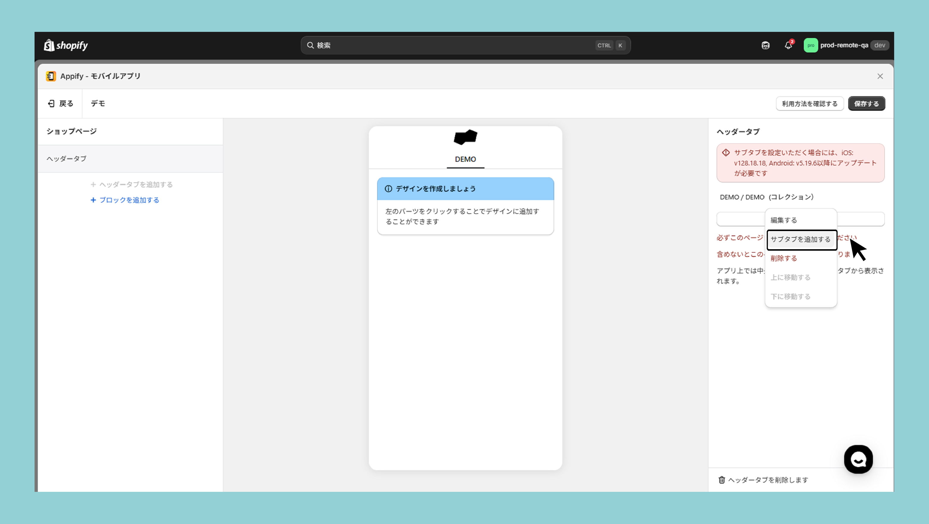 ヘッタータブを追加する>ヘッタータブ>サブタブを追加するより、実際に設定を進めていきます。