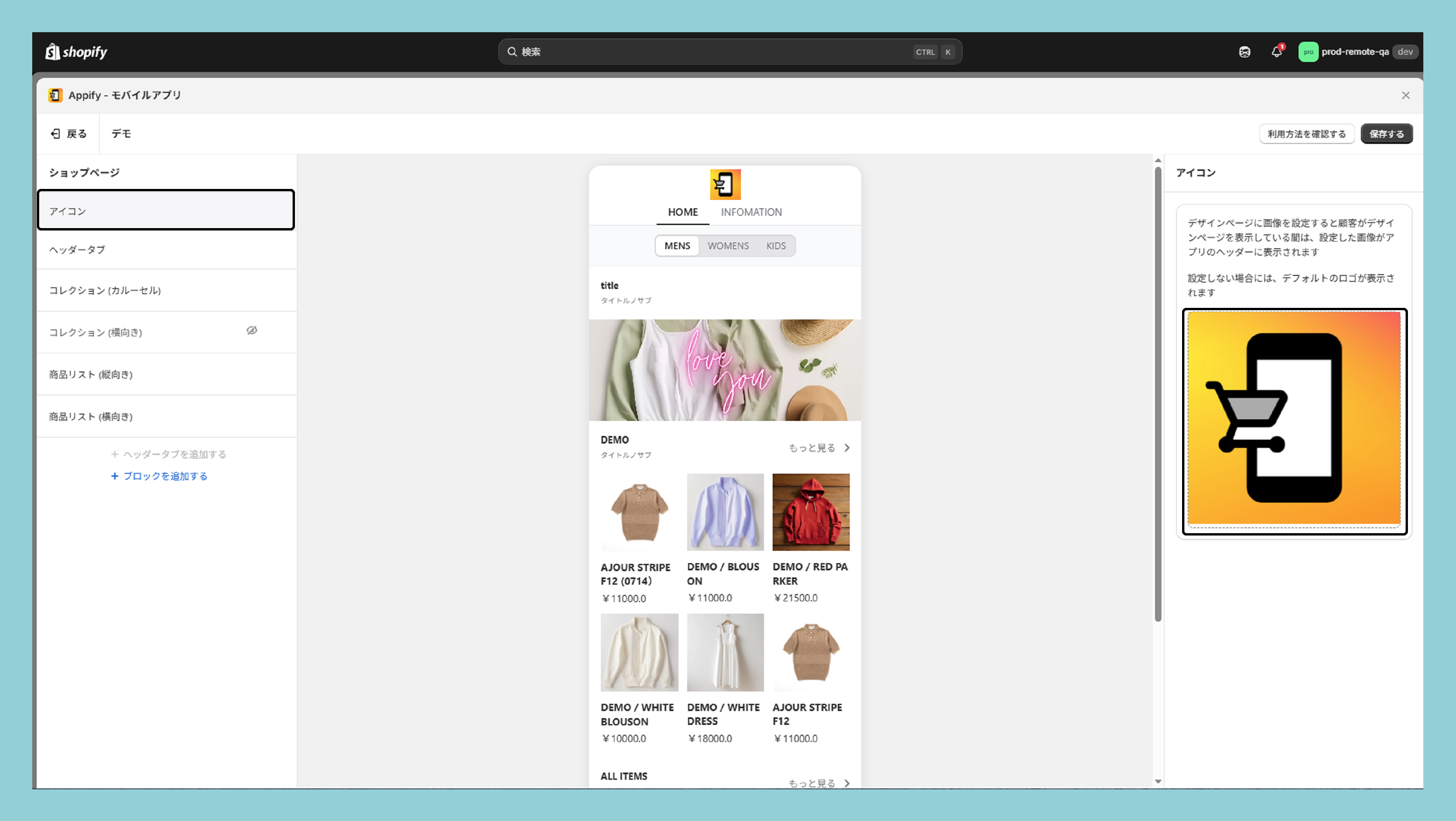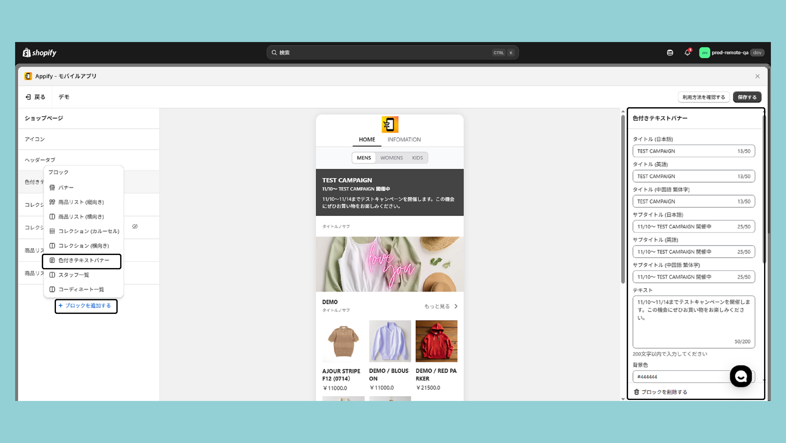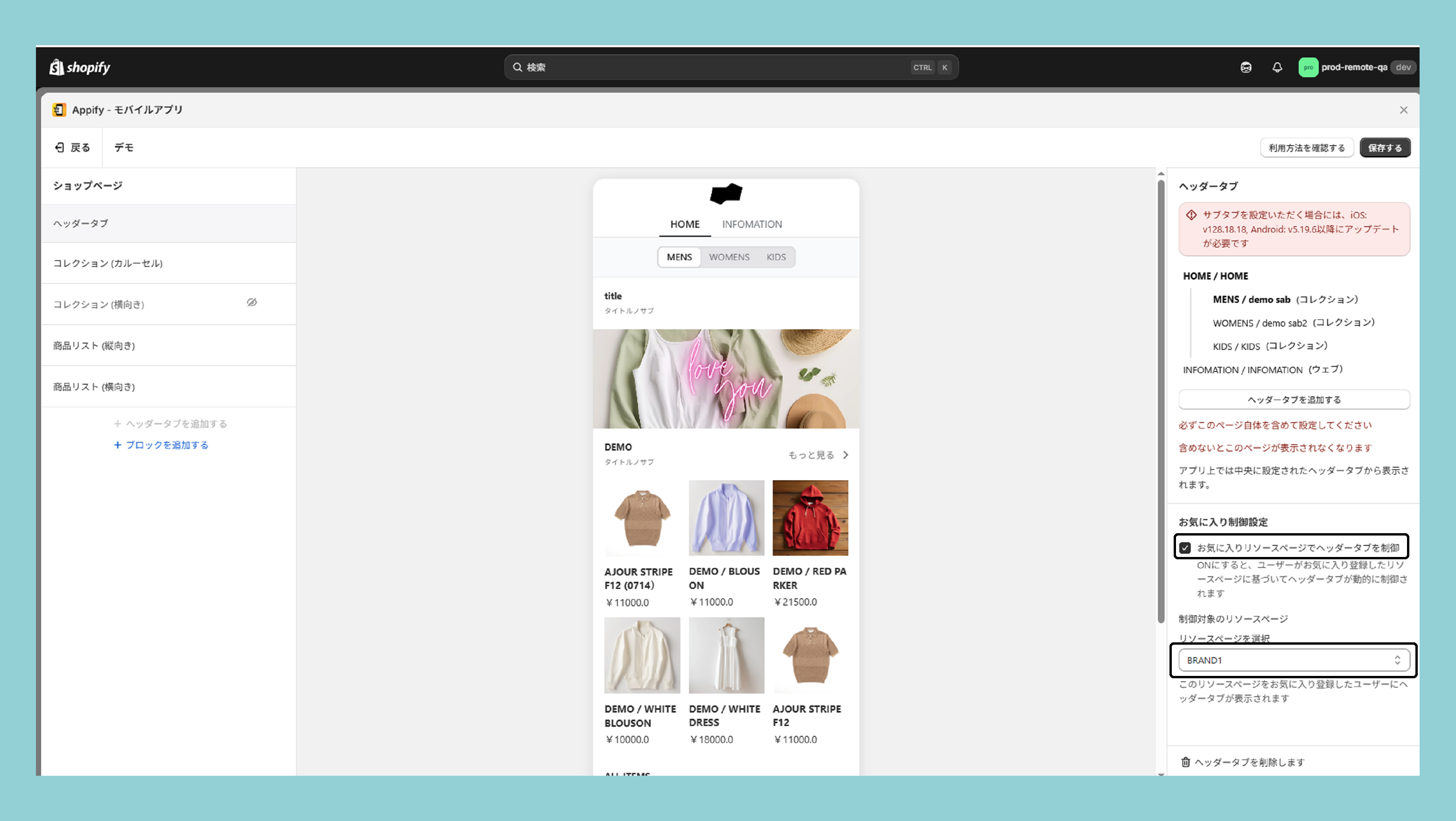 デザインページは、ヘッタータブ、バナー、商品リスト(縦向き)、商品リスト(横向き)、コレクション(カルーセル)、コレクション(横向き)の5種類のブロックを組み合わせて作成します。