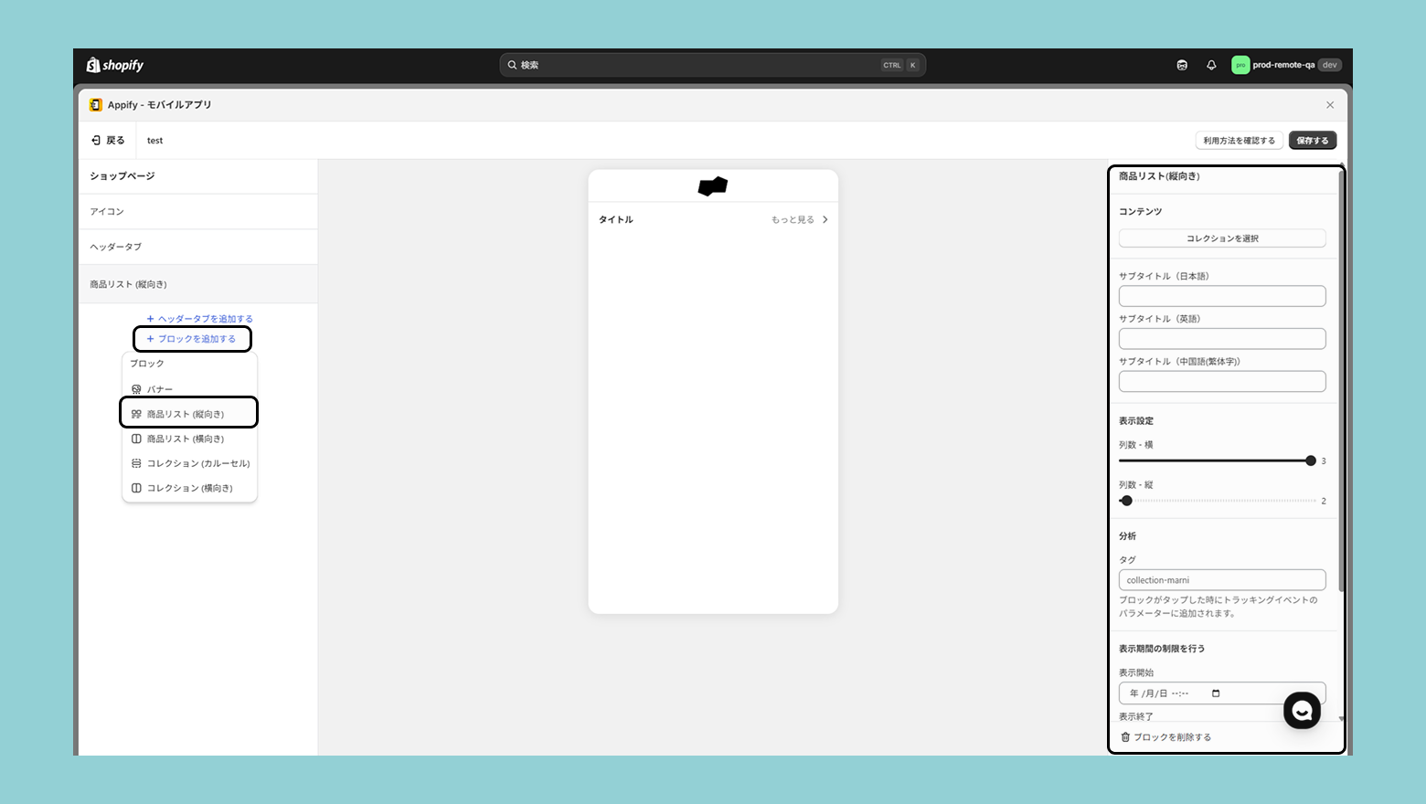 ブロックを追加する>商品リスト(縦向き)を選択し、右の設定画面より実際に設定を進めていきます。