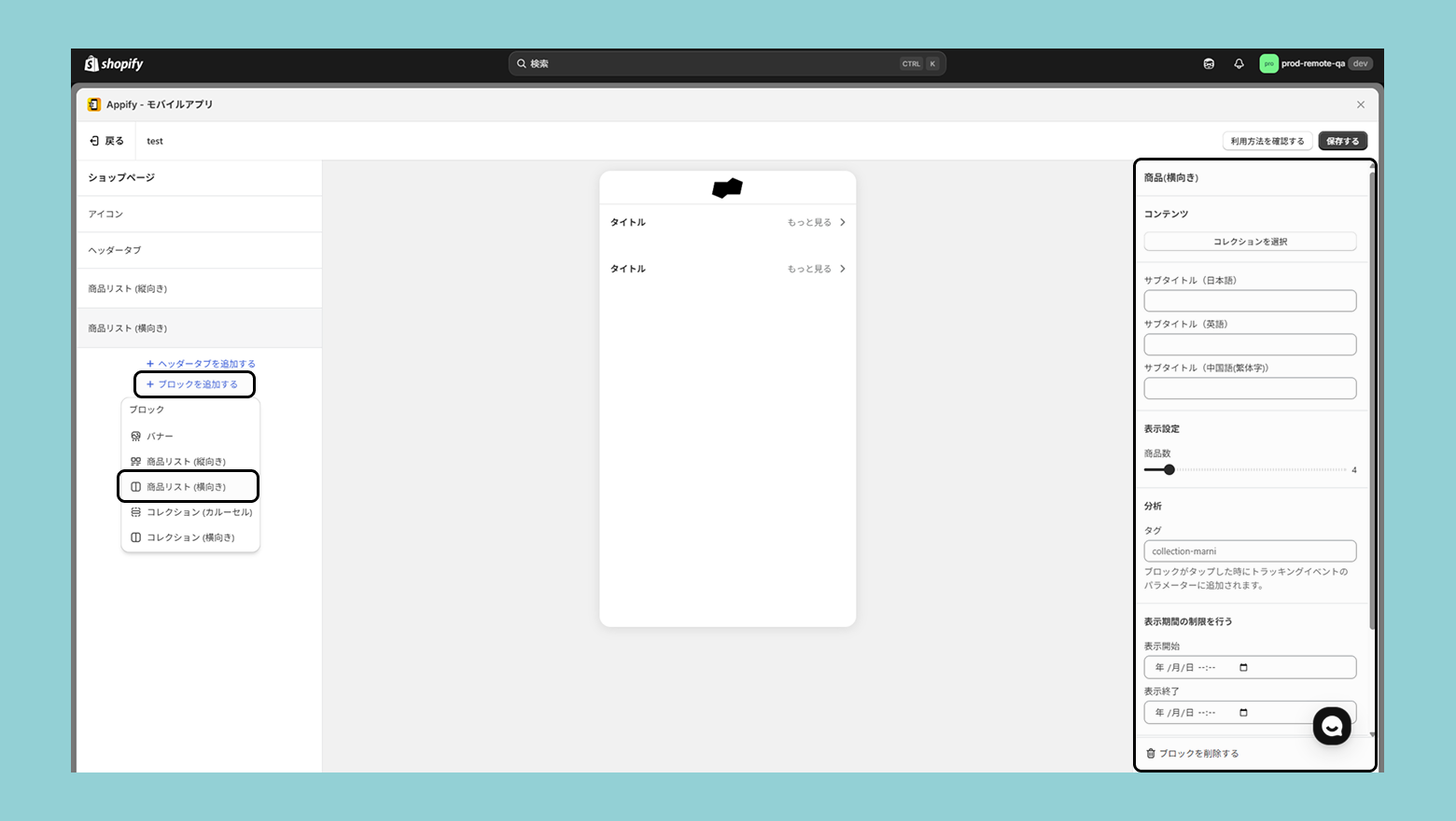 ブロックを追加する>商品リスト(横向き)を選択し、右の設定画面より実際に設定を進めていきます。