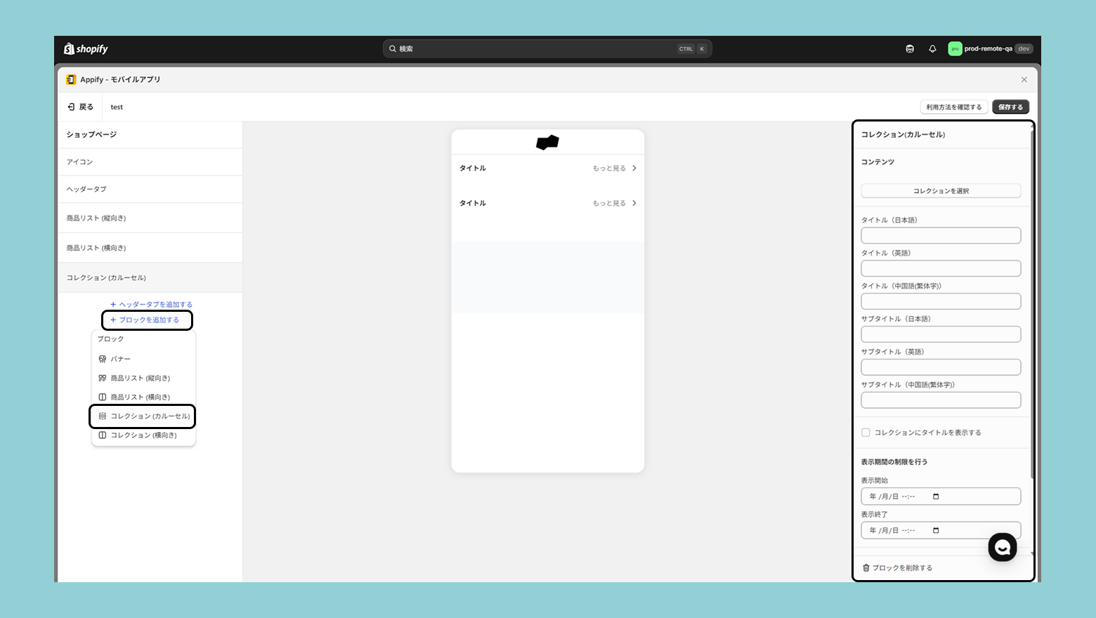 メタフィールドの設定が終わったら、Shopifyの商品管理からコレクションへ進み、対象コレクションをクリックして移動します。コレクション内のメタフィールドにタイトルを入力すると入力した値がモバイルアプリに表示されます。