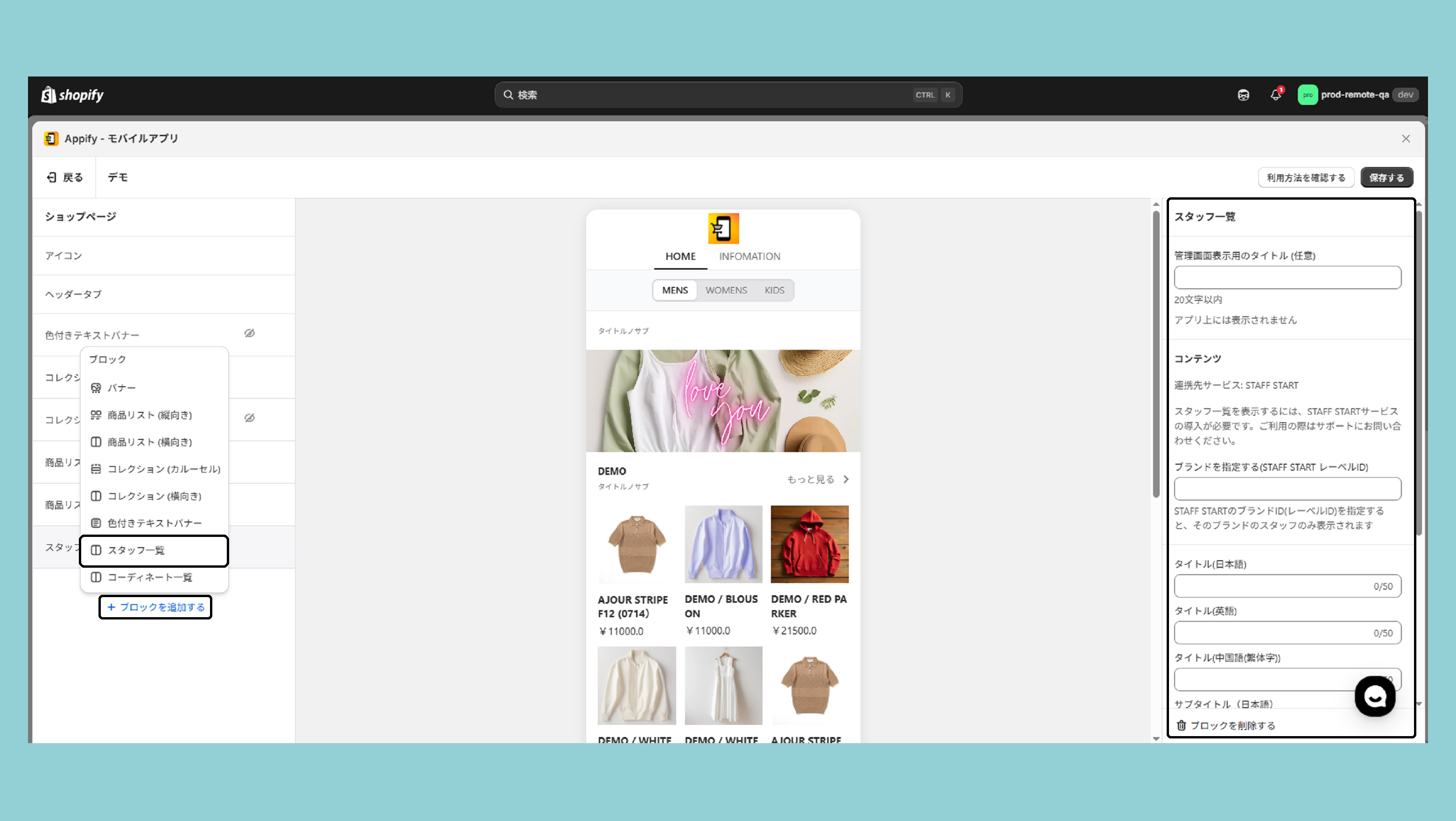 ブロックを追加する>スタッフ一覧を選択し、右の設定画面より実際に設定を進めていきます。