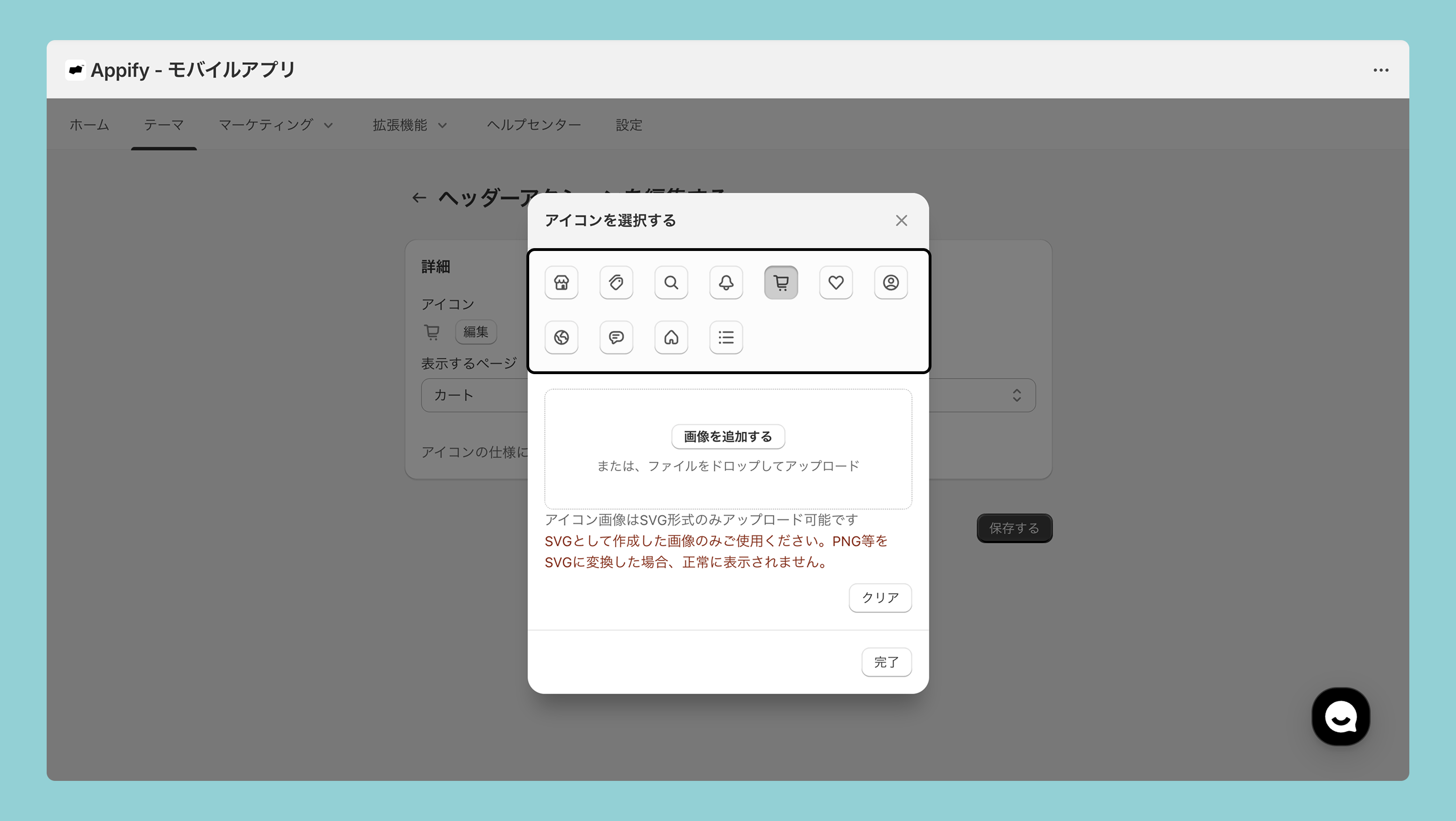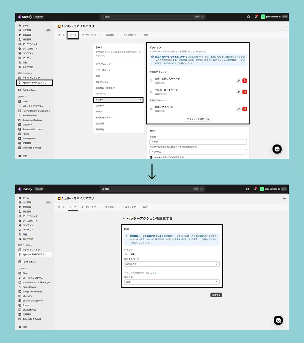 モバイルアプリ管理画面 >テーマ >ヘッダー>アクション>アクションを追加から設定が可能です。