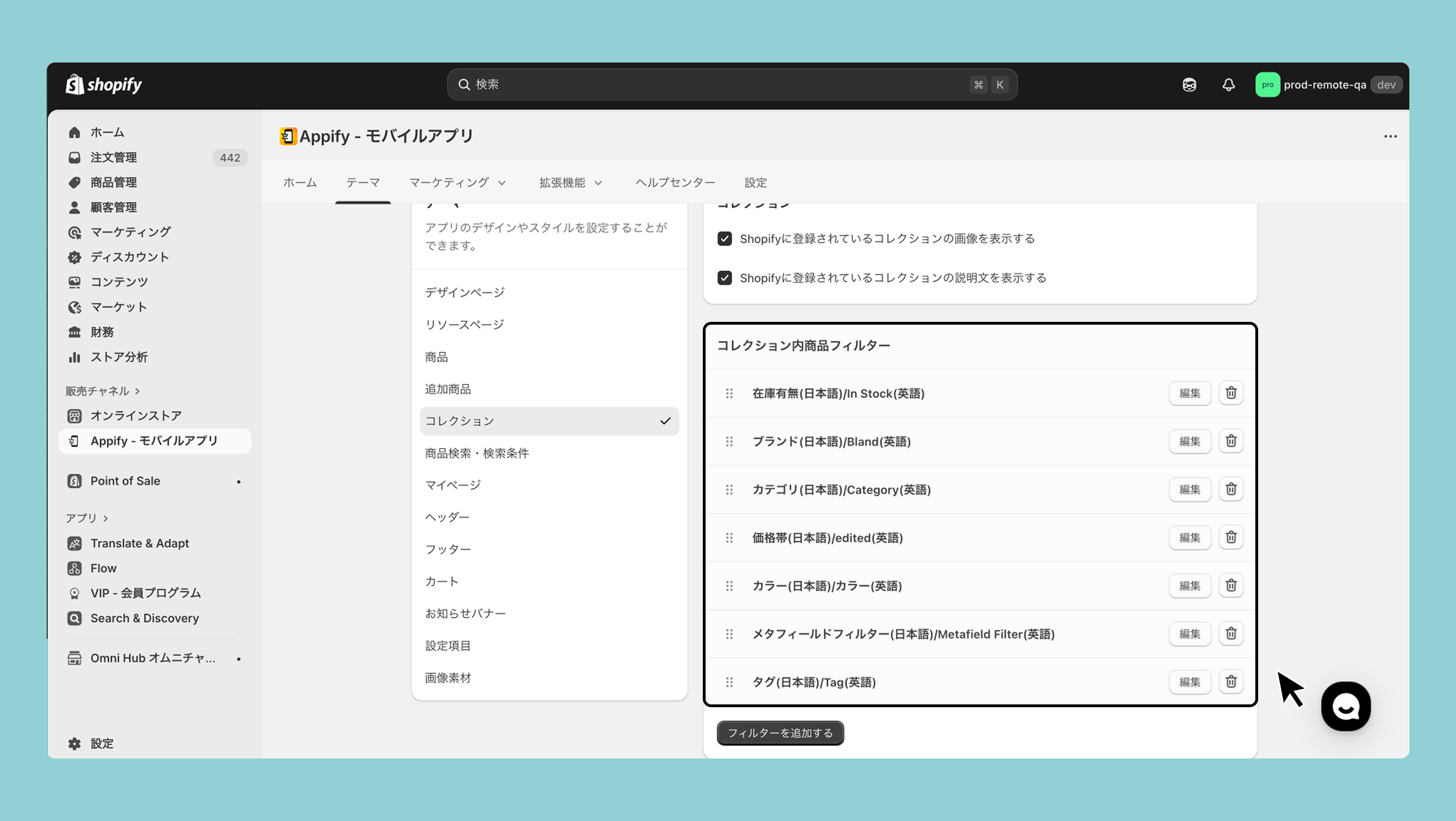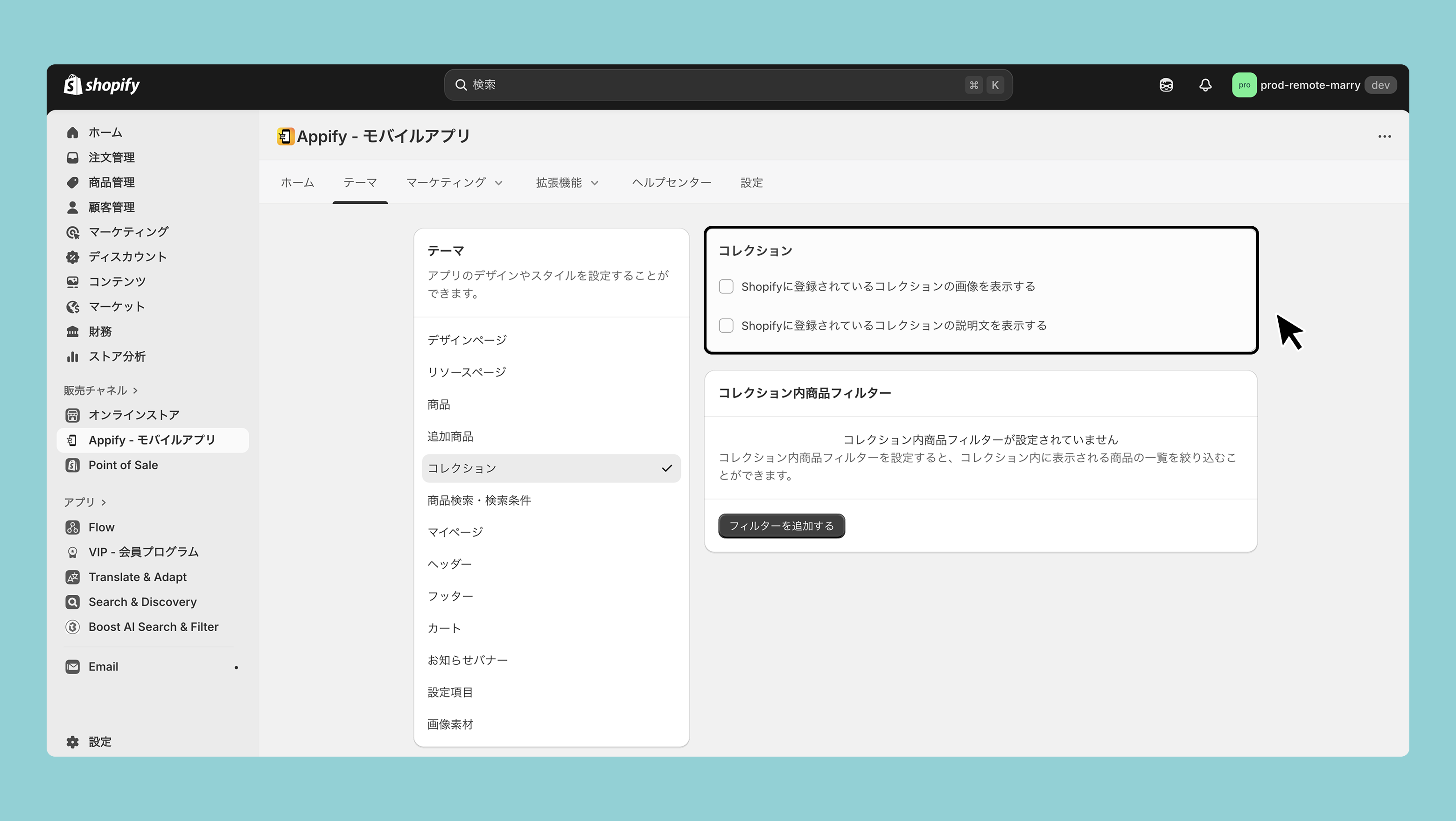 Appify管理画面>テーマ>コレクションから設定可能です。