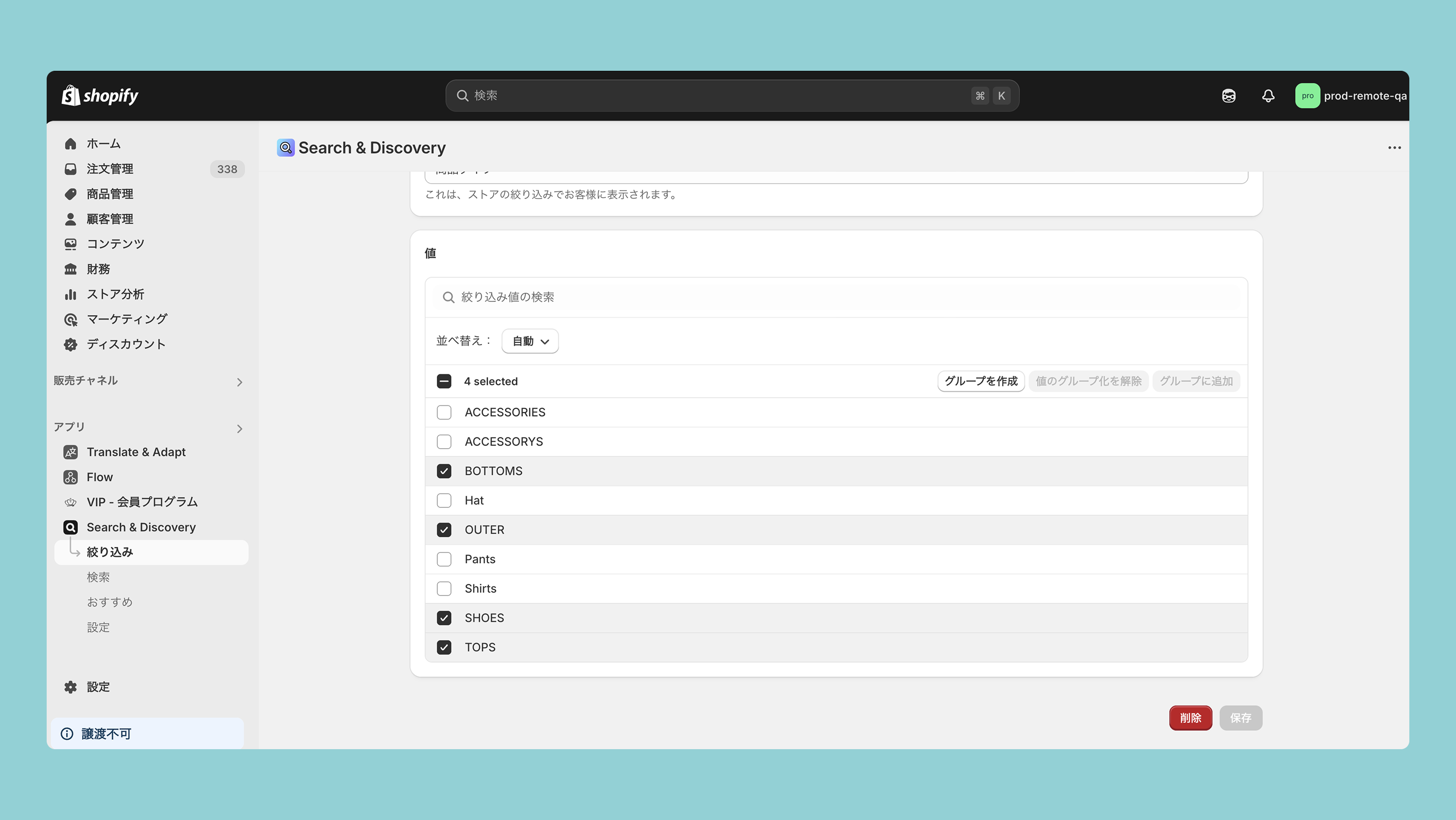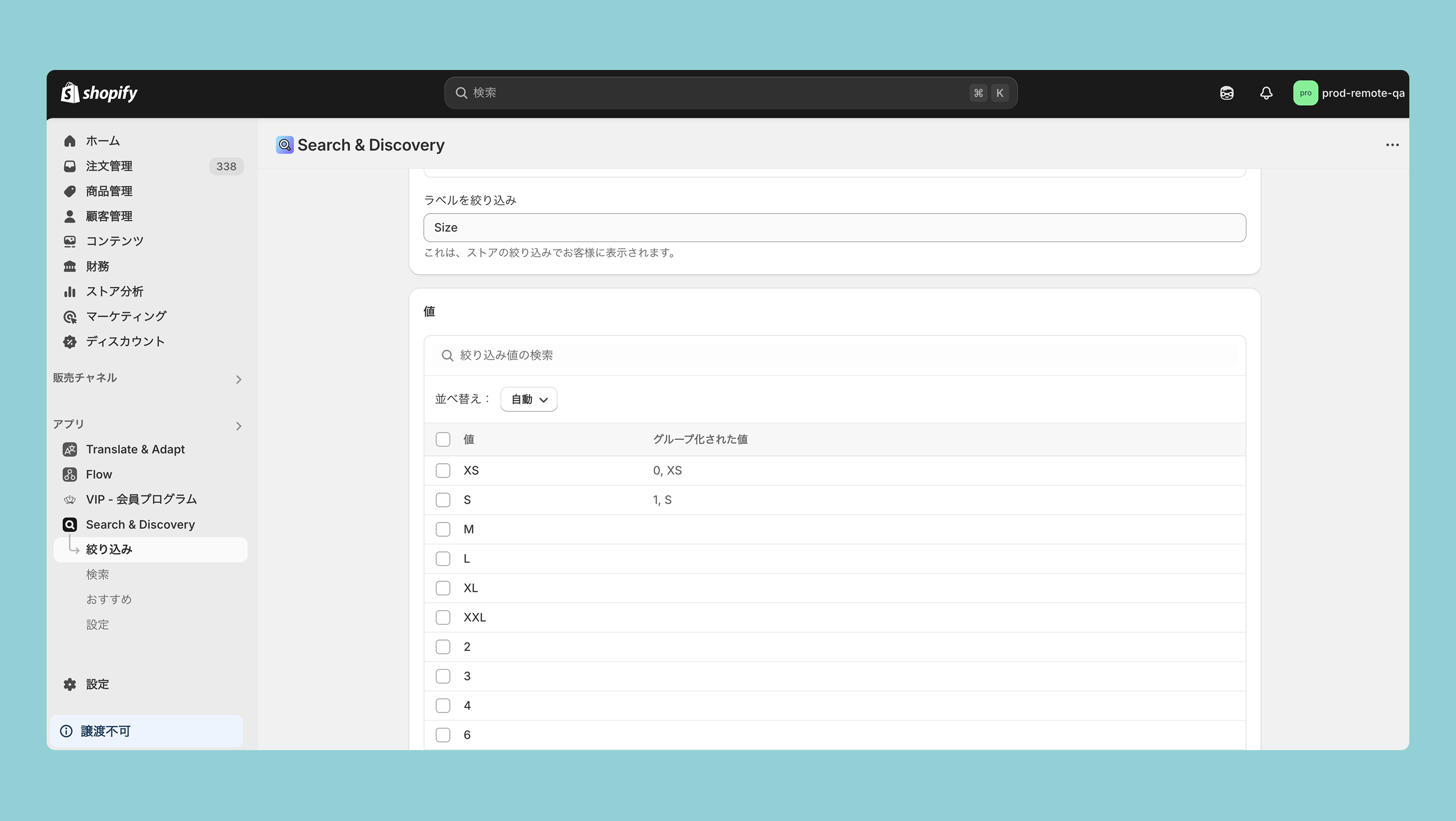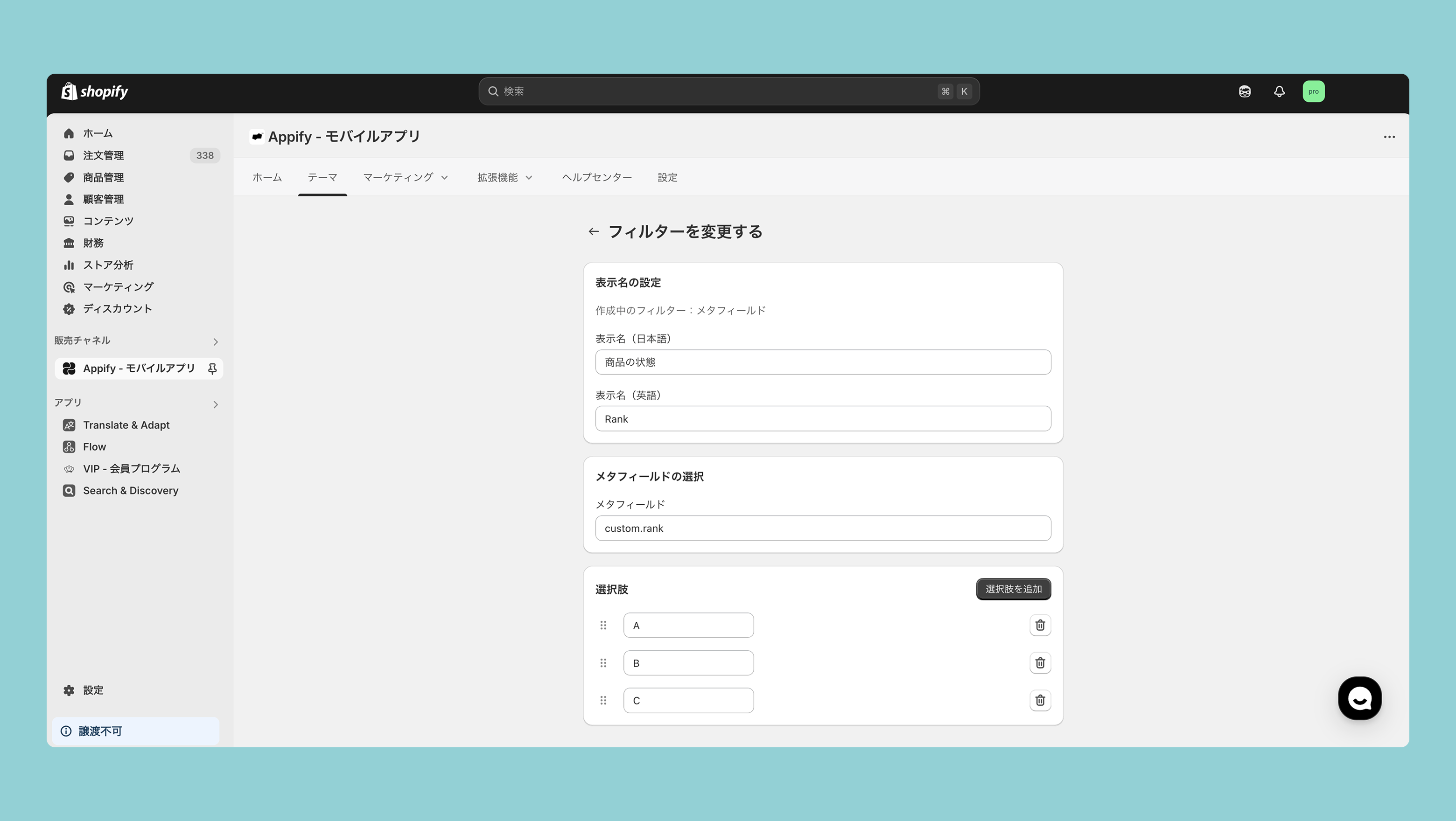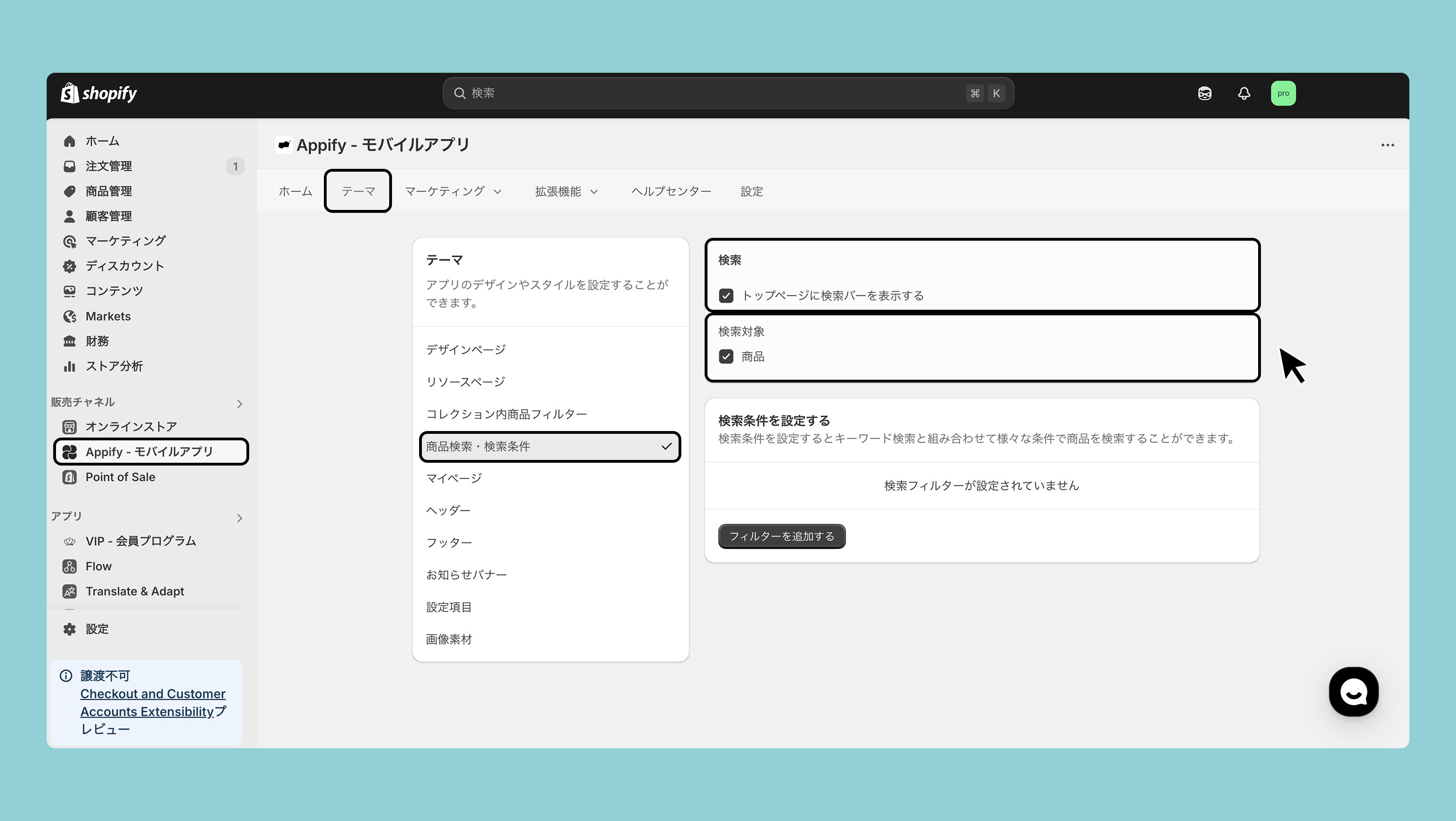 販売チャネル>Appify>テーマ>商品検索・検索条件>検索条件を設定する>フィルターを追加するより