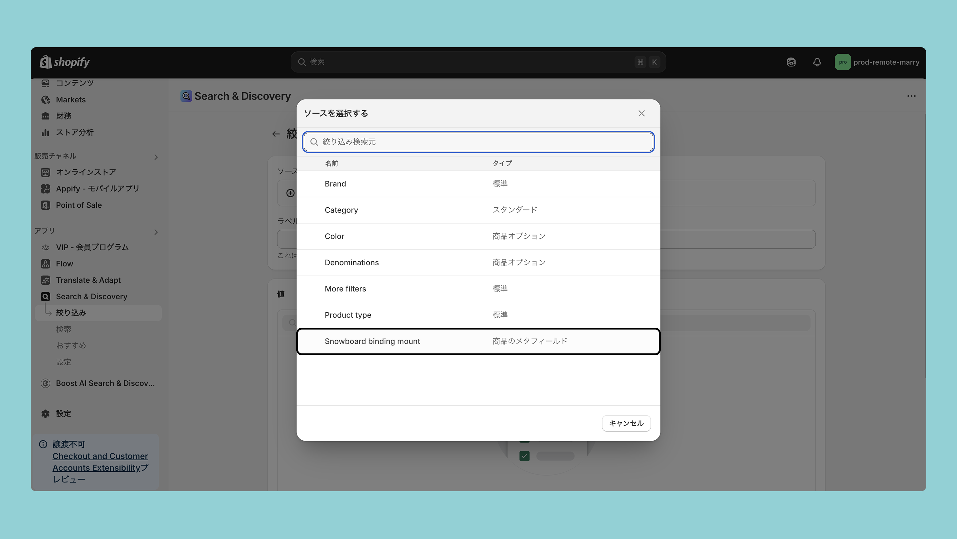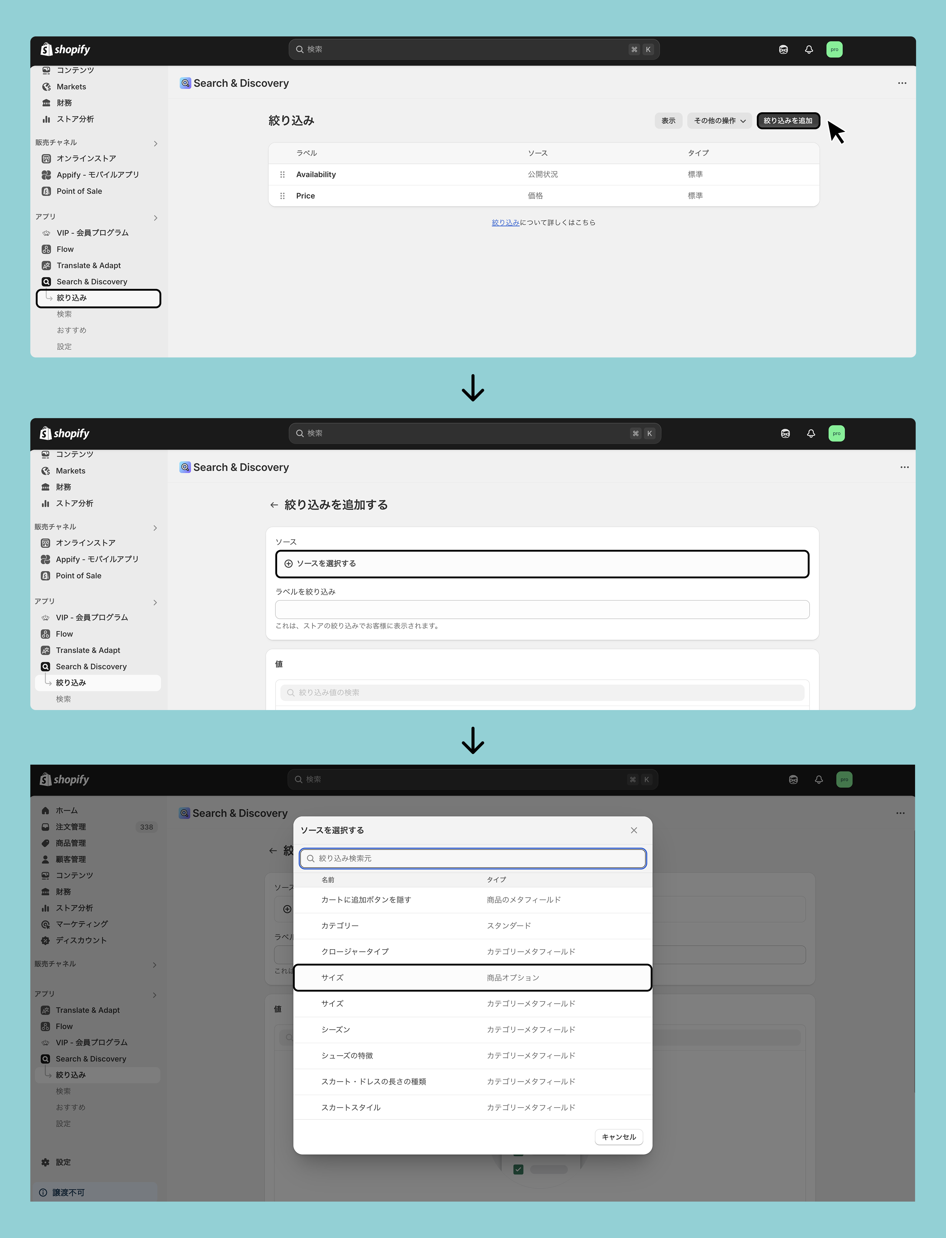 Shopify Search & Discovery > 絞り込み > 絞り込みを追加 > ソースを追加 > 追加したい商品のメタフィールドまたはカテゴリーのメタフィールドを選択