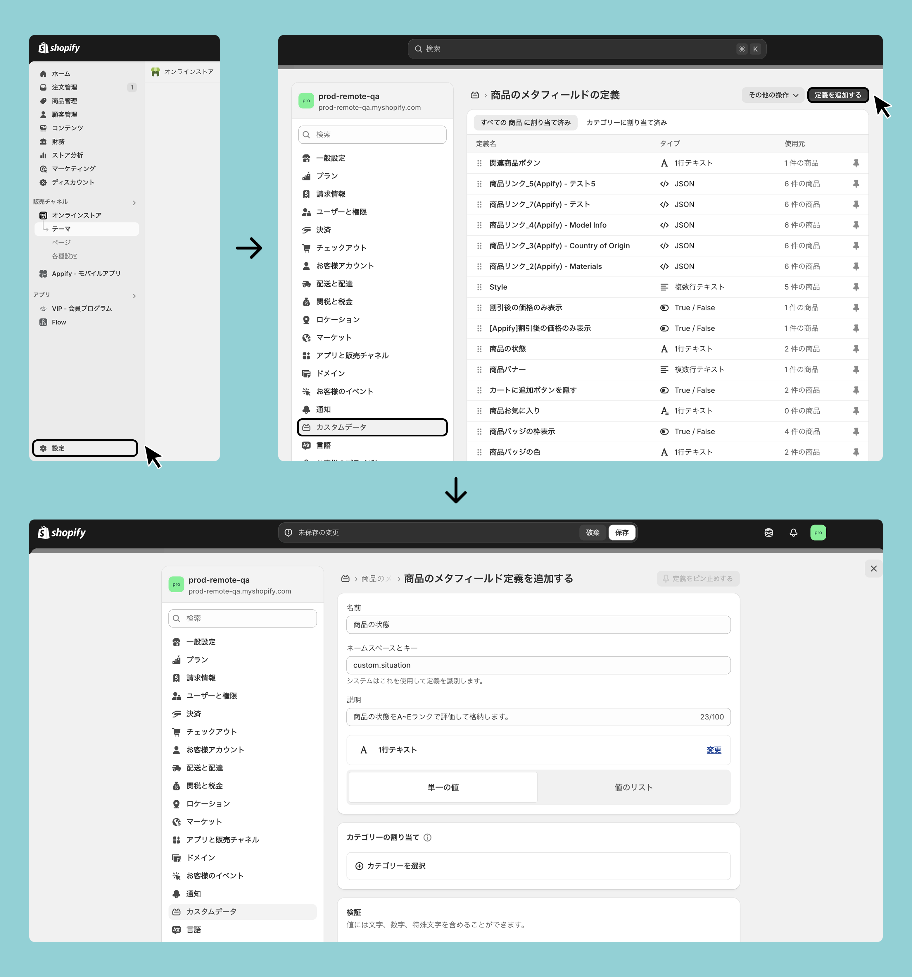 設定>カスタムデータ>商品>定義を追加するから設定してください。